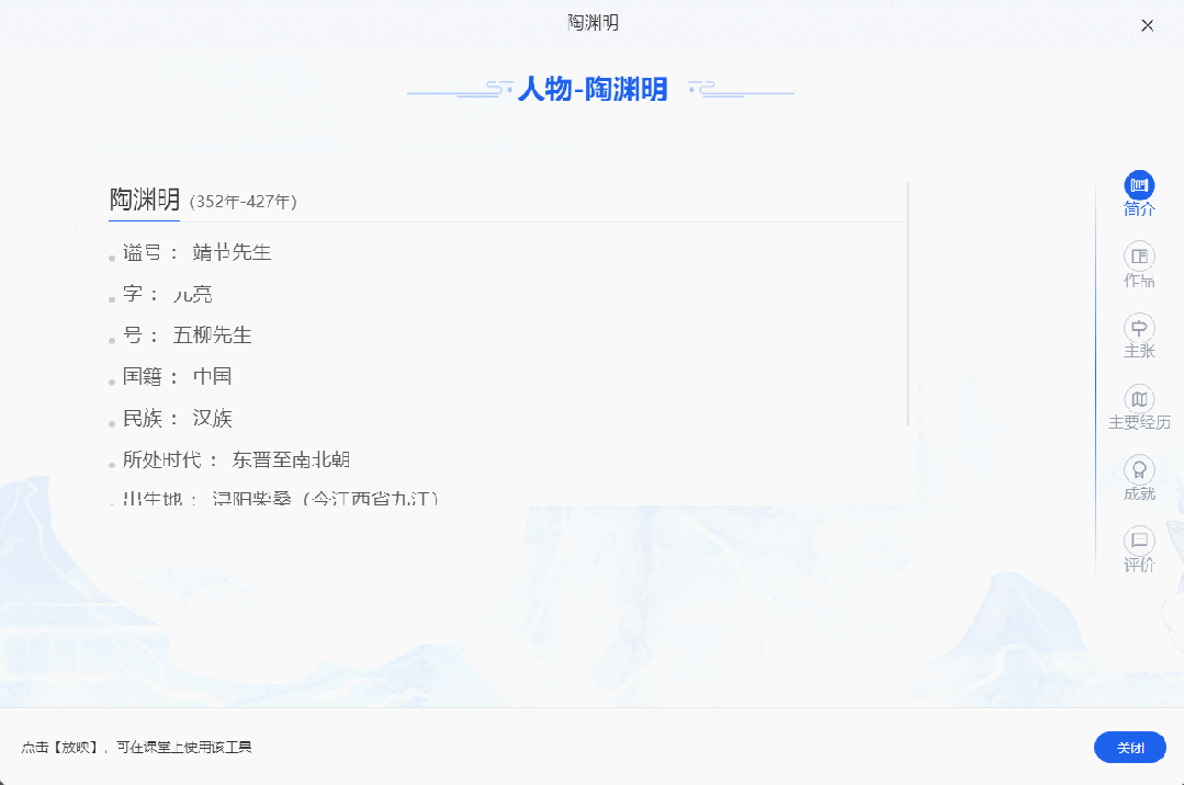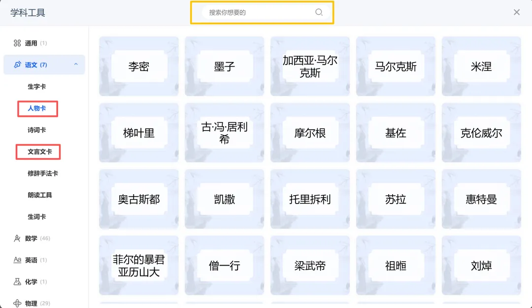 根据教学需要选择并插入【人物卡】或【文言文卡】,也可通过搜索人物名字或文言文篇目调用相关资源。