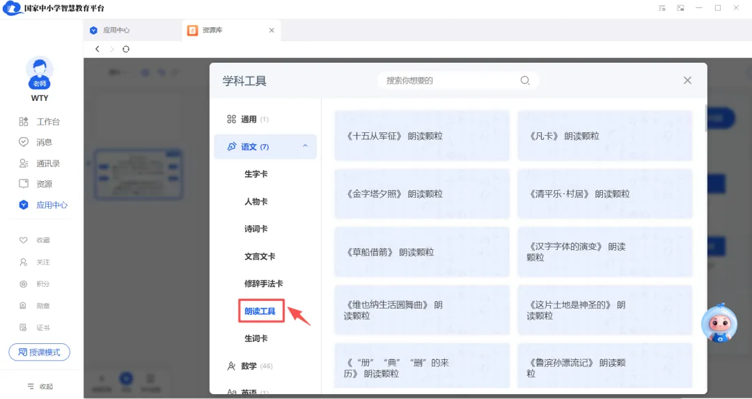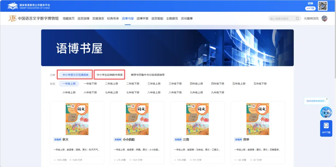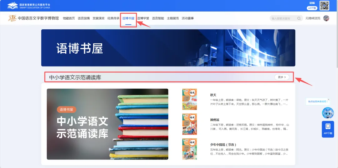 教师可登录语博网页端(https://szyb.smartedu.cn/),进入“语博书屋”,在分类中选择“中小学语文示范诵读库”,即可收听相关课文朗读;同时也可浏览“中小学生经典数字阅读”获取更多拓展资源。