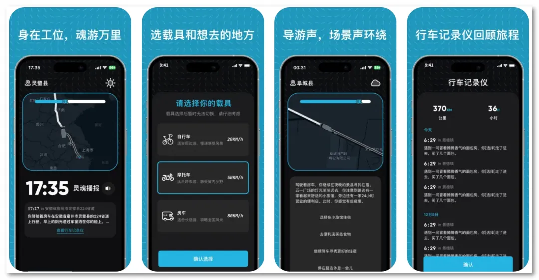 软件特色包括选择不同的交通工具(房车、摩托车、自行车)进行虚拟旅行,并提供导游讲解和广播电台播放,同时拥有动态的行驶轨迹视觉体验。此外,它还支持行车记录仪、足迹回顾和统计等功能。