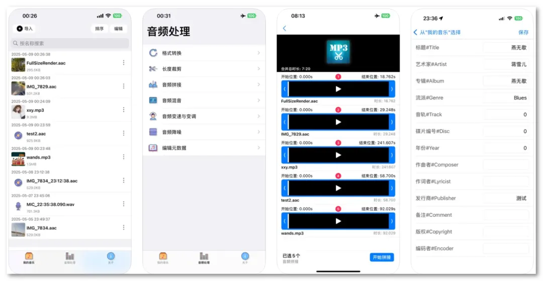 软件特色包括支持多种音频格式转换、视频提取音频、音频拼接、裁剪、混音、变速、变调、降噪等功能。此外,它还支持音频排序、录音和播放功能。