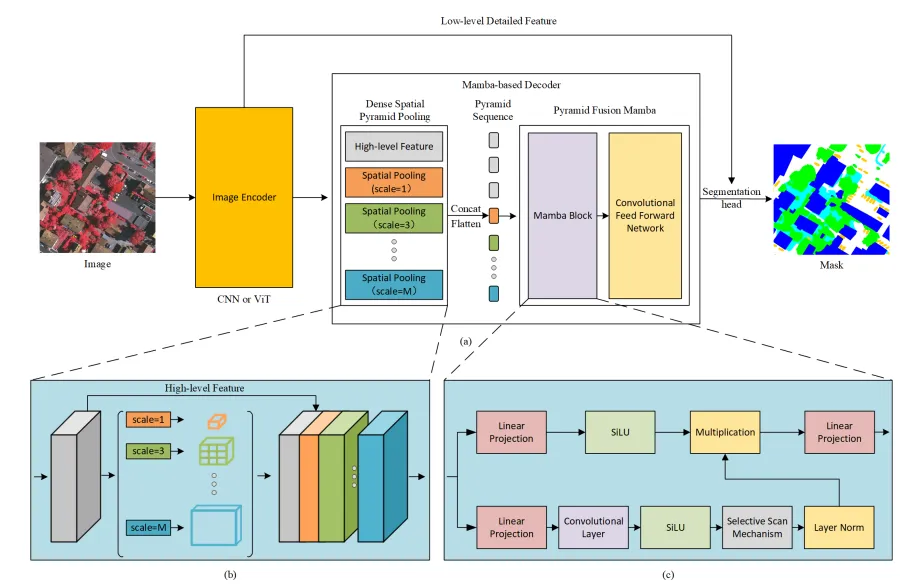 内容:本文聚焦于遥感影像语义分割任务,针对传统金字塔特征融合方法存在的不足,创新性地提出 PyramidMamba 模型。在遥感影像中,目标尺度多样、场景复杂,传统方法难以充分挖掘不同尺度特征的价值,且在捕捉长距离依赖关系上表现欠佳,这限制了语义分割的精度。PyramidMamba 重新审视金字塔特征融合策略,引入选择性空间状态模型。选择性机制如同智能筛子,能精准筛选不同层级金字塔特征里的关键信息,剔除冗余和无效特征,提升特征质量。空间状态模型则具备强大的建模能力,可有效捕捉遥感影像中目标间的长距离依赖关系,增强模型对复杂场景的理解与分析能力。实验结果表明,PyramidMamba 在多个公开遥感影像语义分割数据集上均取得了显著的性能提升,分割精度大幅提高,为遥感影像语义分割领域提供了新的研究思路和有效的解决方案。