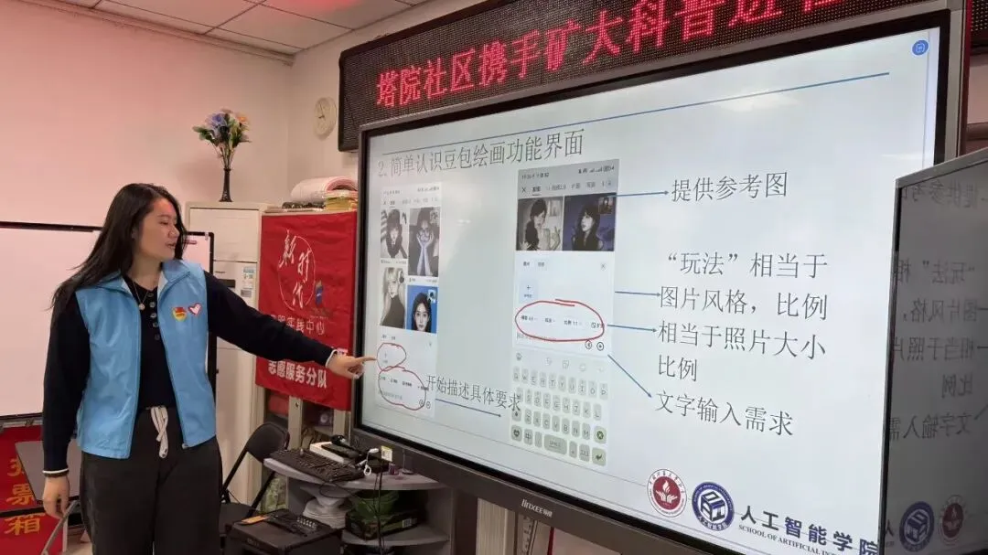 同时采用“理论讲解+一对一实操指导”的模式,志愿者们耐心细致地陪伴居民熟悉AI工具的图片制作全流程。从关键词的精准描述到画面风格的调整,从分辨率设置到导出保存,他们逐一解答操作疑问,手把手带领居民完成从构思到生成作品的全过程。