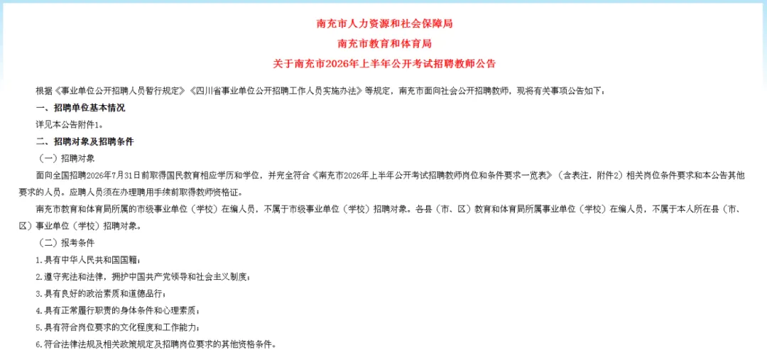 南充市人力资源和社会保障局南充市教育和体育局关于南充市2026年上半年公开考试招聘教师公告