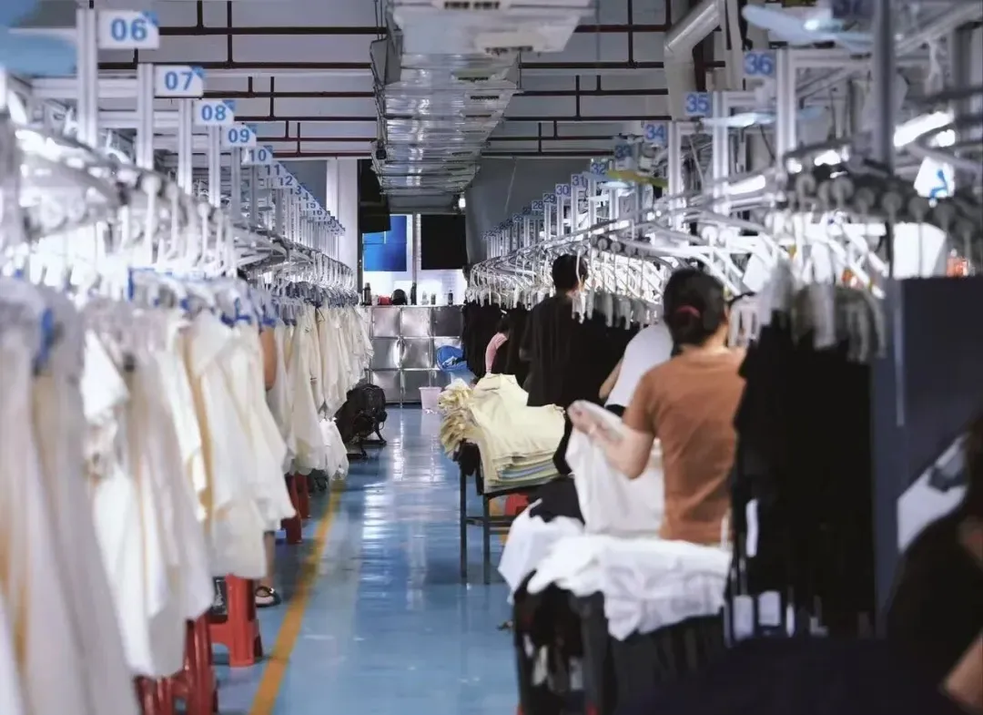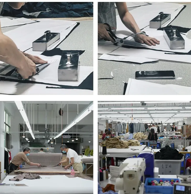 超大规模的车间,专业的机器设备,经验丰富的师傅们在生产线上有条不紊的进行车缝、裁剪等步骤。