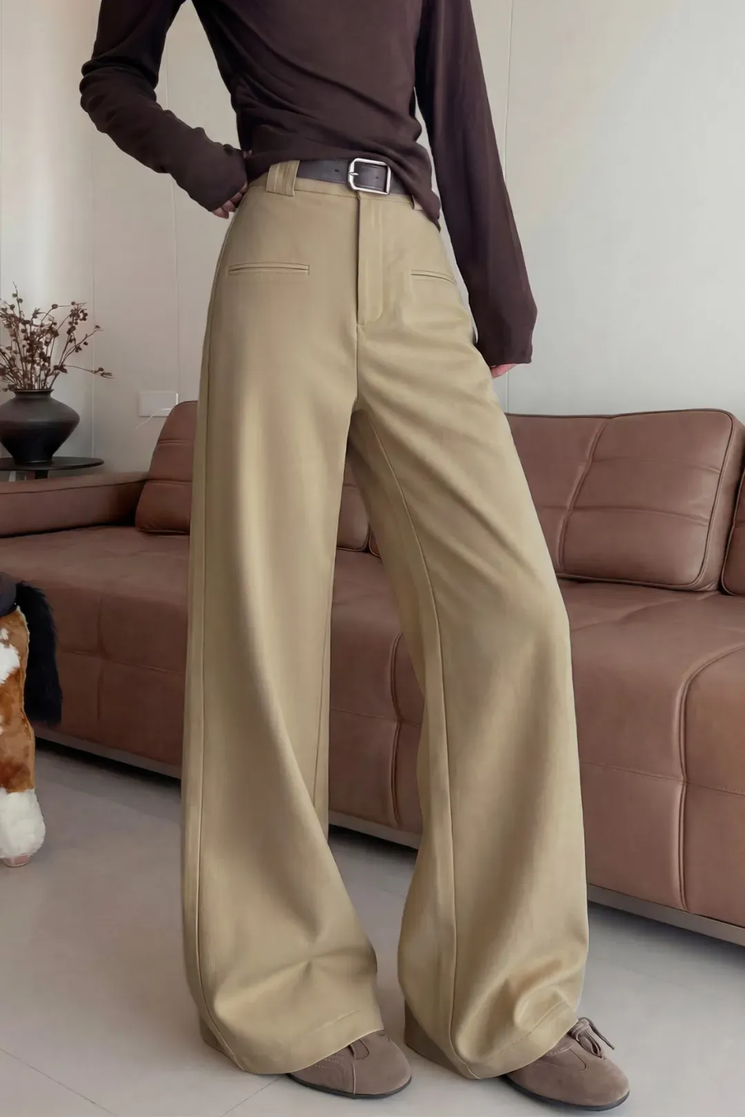 宽松的裤管搭配高腰设计,既能有效遮盖腿部肉肉,又能在视觉上让你显瘦显高,仿佛拥有了模特般的身材比例。