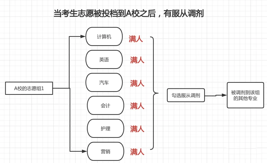 ① 服从专业调剂,当所填专业志愿全部无法录取时,高校会将其调剂到该专业组中尚有计划余额的其他专业。