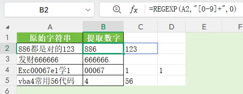 公式会提取出原始字符串中所有连续出现的数字。当原始字符串中有多组连续数字时,得到的结果是一个单行数组。