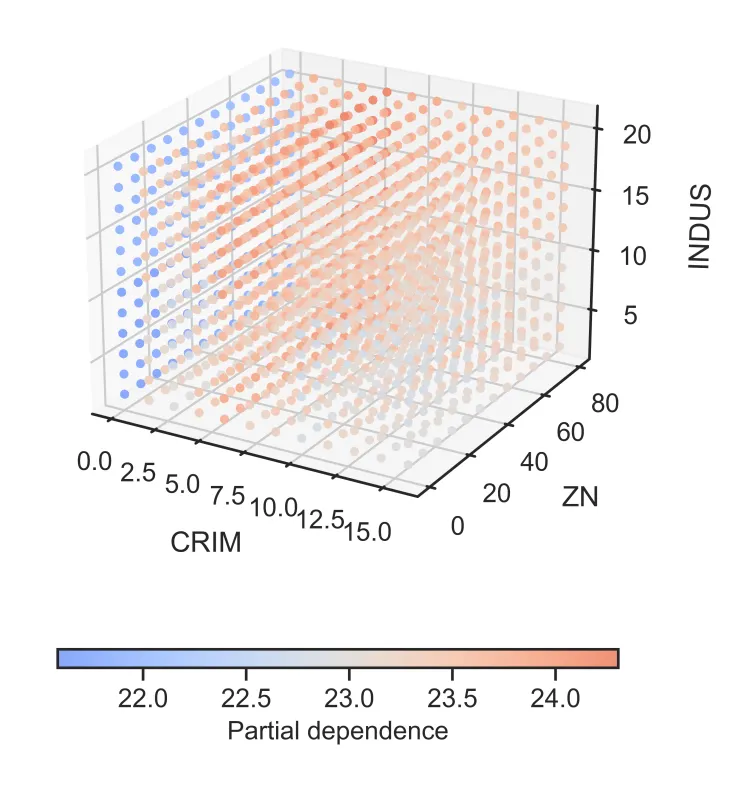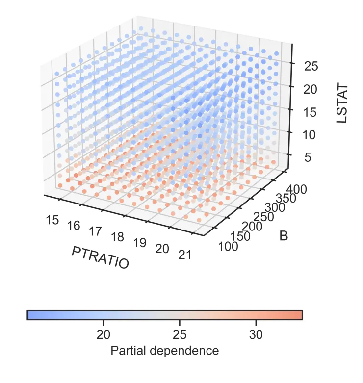 – 色彩编码: 利用颜色的冷暖变化(如蓝-红渐变)来表示模型预测值(Partial Dependence)的高低。这种视觉编码让读者能直观感受到:在三维空间的哪个角落,模型的响应值最高(红色聚集区),哪个角落最低(蓝色聚集区)。