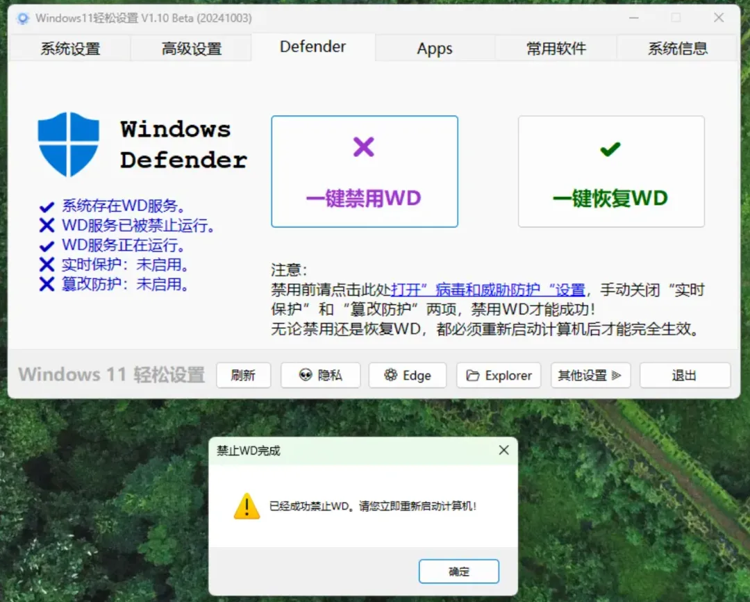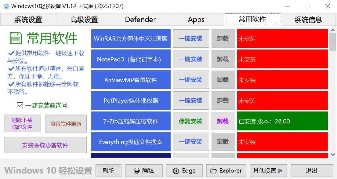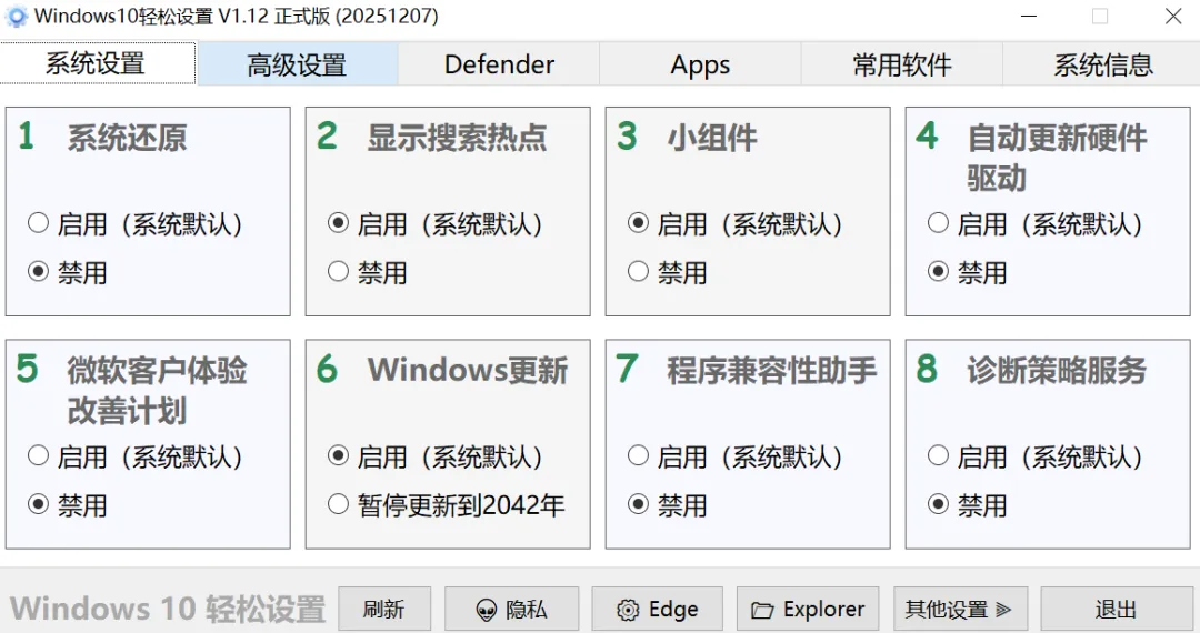 这是一款专门给Win11、win10系统用的小工具,界面简洁,操作简单,而且功能超级全,不仅能一键优化,还可以个性化定制各种设置。比如可以禁用系统还原、关掉搜索热点、去掉烦人的小组件,还能控制Windows更新、关闭UAC(老弹窗提醒的程序)还可以卸载Windows自带的那些用不上的组件和应用。