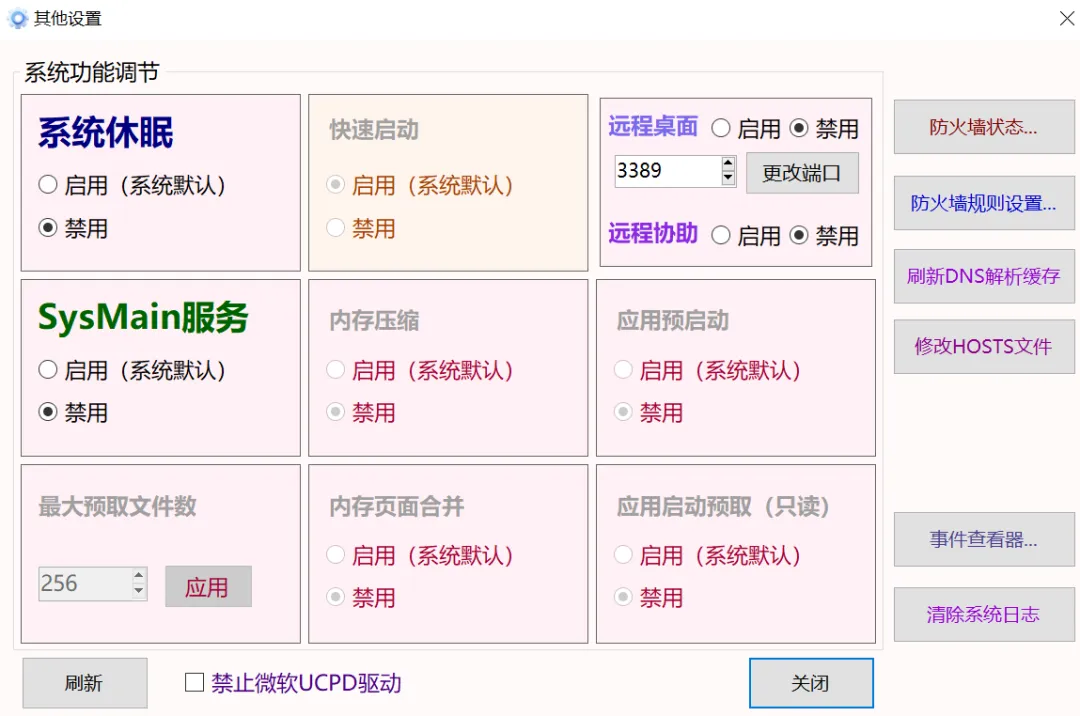 其他设置里面包括系统休眠、修改Hosts等功能。