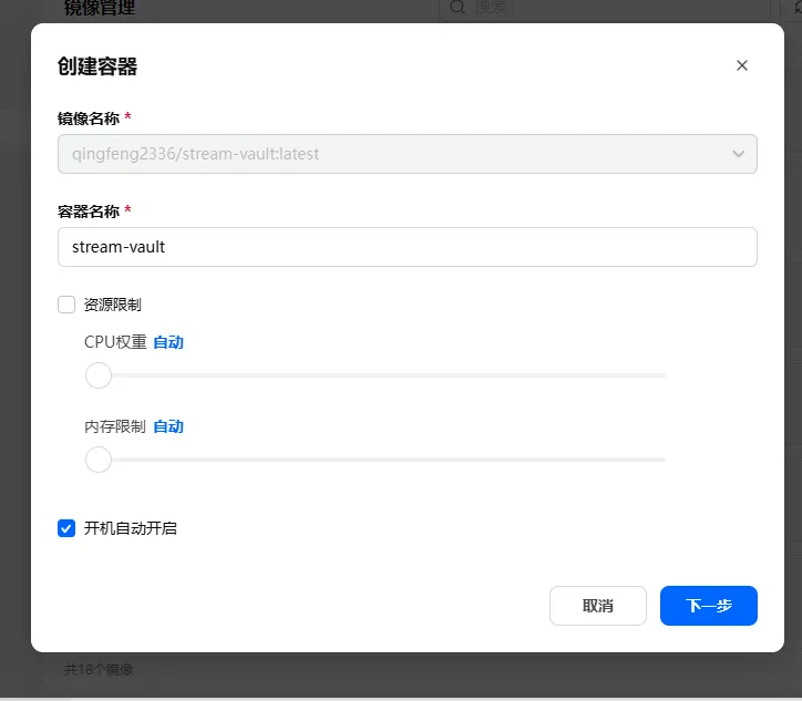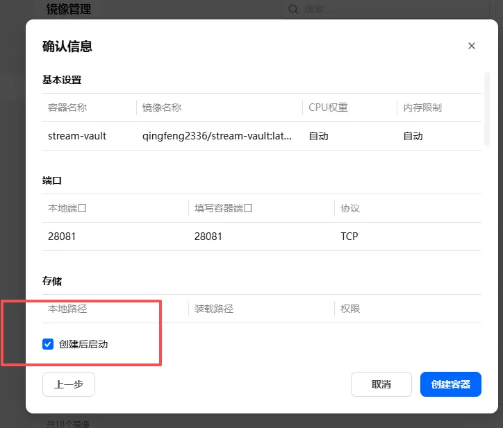 然后点击下一步,勾选上创建后立即启动,点击创建容器