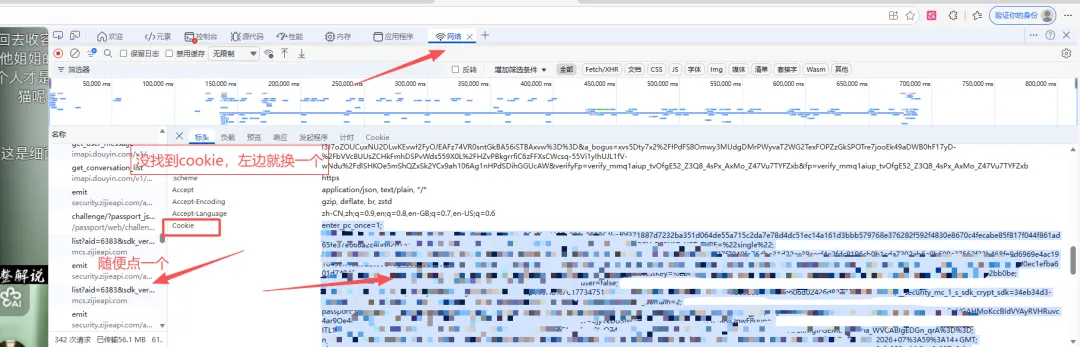 在Network(网络)标签页找到请求 复制Cookie值并粘贴到配置中