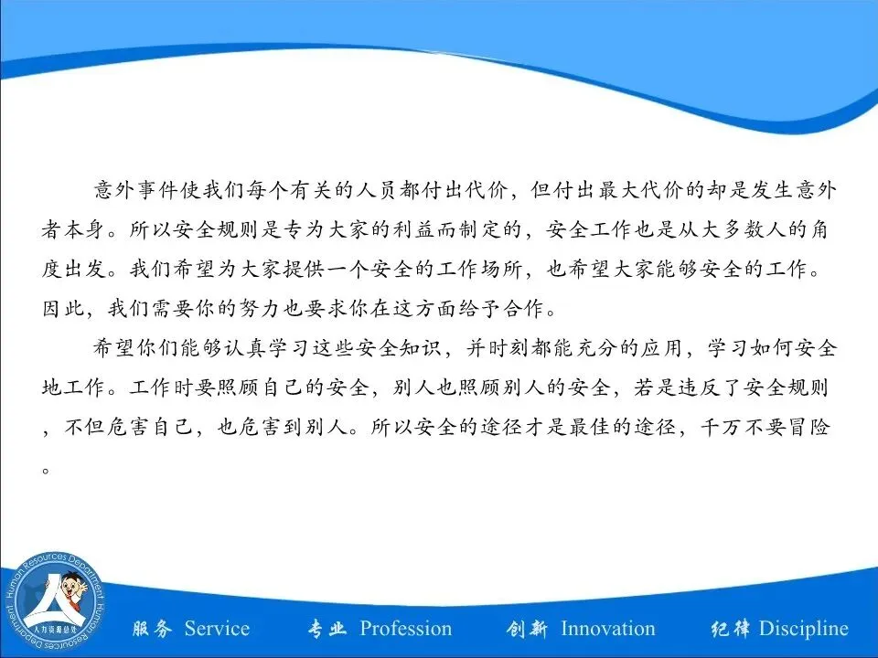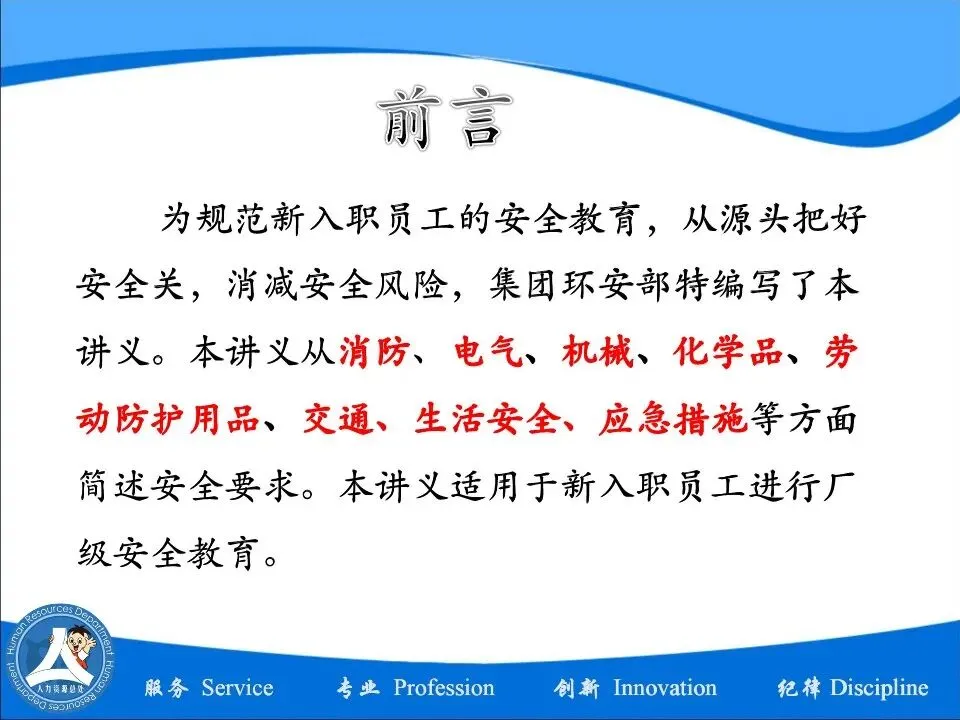 工厂新员工安全培训资料–PPT编辑档可下载! 企管知识分享 工厂新员工安全培训资料 –编辑档可直接下载! s点击文章结尾的【阅读原文】即可下载! 为规范新入职员工的安全教育,从源头把好安全关,消减安全风险,集团环安部特编写了本讲义。本讲义从消防、电气、机械、化学品、劳动防护用品、交通、生活安全、应急措施等方面简述安全要求。本讲义适用于新入职员工进行厂级安全教育。 工厂新员工安全培训资料 企管资料获取 文件领取方式:发送[文章标题或文件名] 相关资料获取:发送[自助获取](分享已超2万份) 点下方阅读原文,领取学习资料!