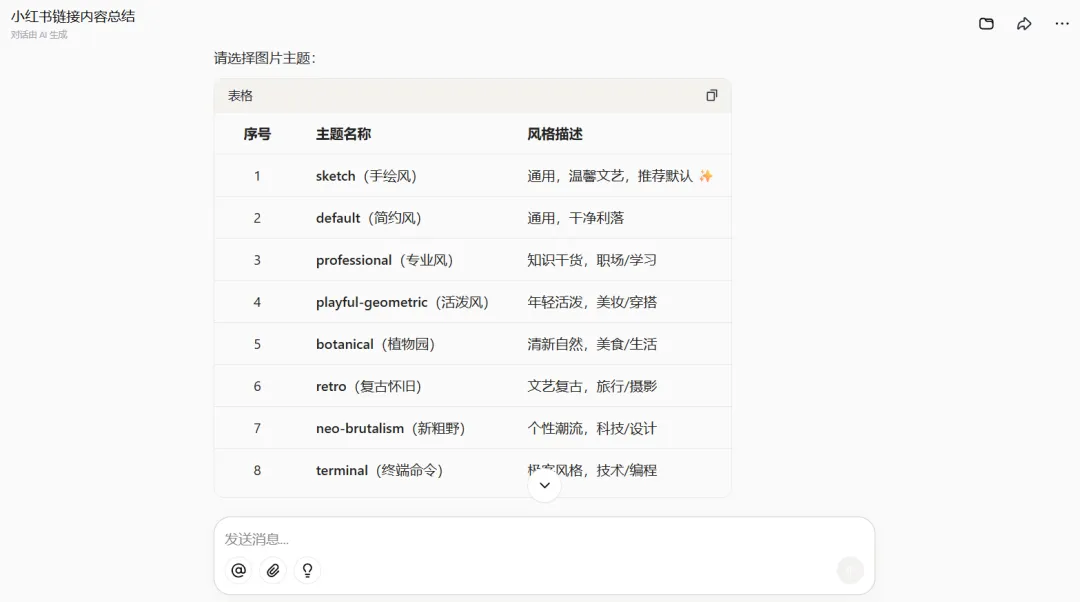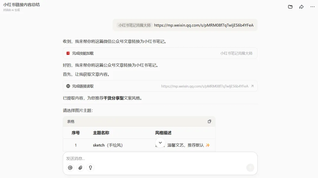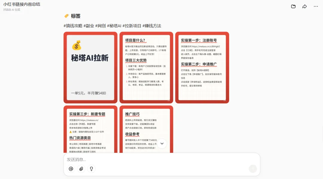 不管你是啥类型的链接,直接发送,工具就会智能解析,自动生成小红书标题、文案、标签、图片。
