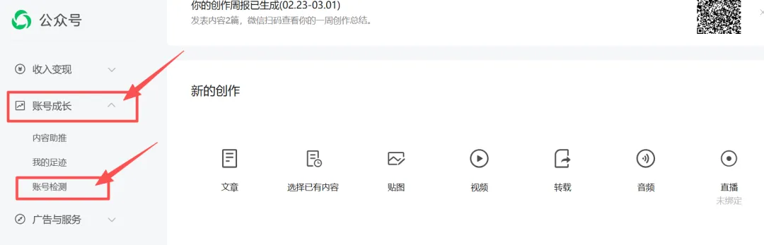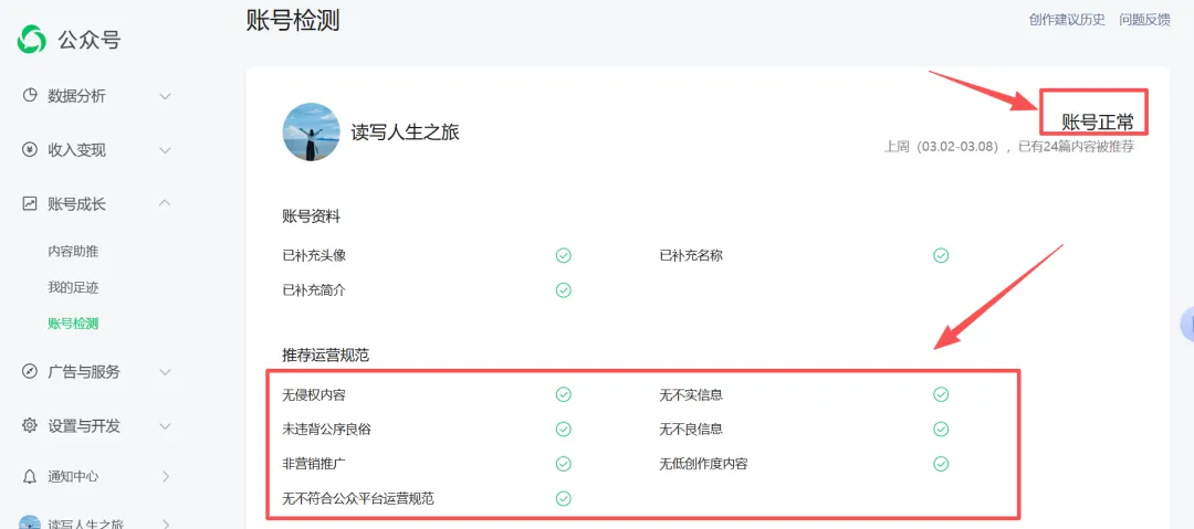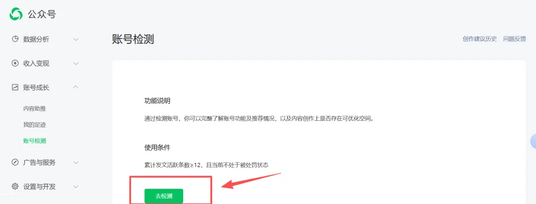 操作步骤:从公众号首页,左侧功能栏区,找到【账号成长】,点击旁边的三角形,展开页面后,点击【账号检测】测一下自己的账号是否正常。