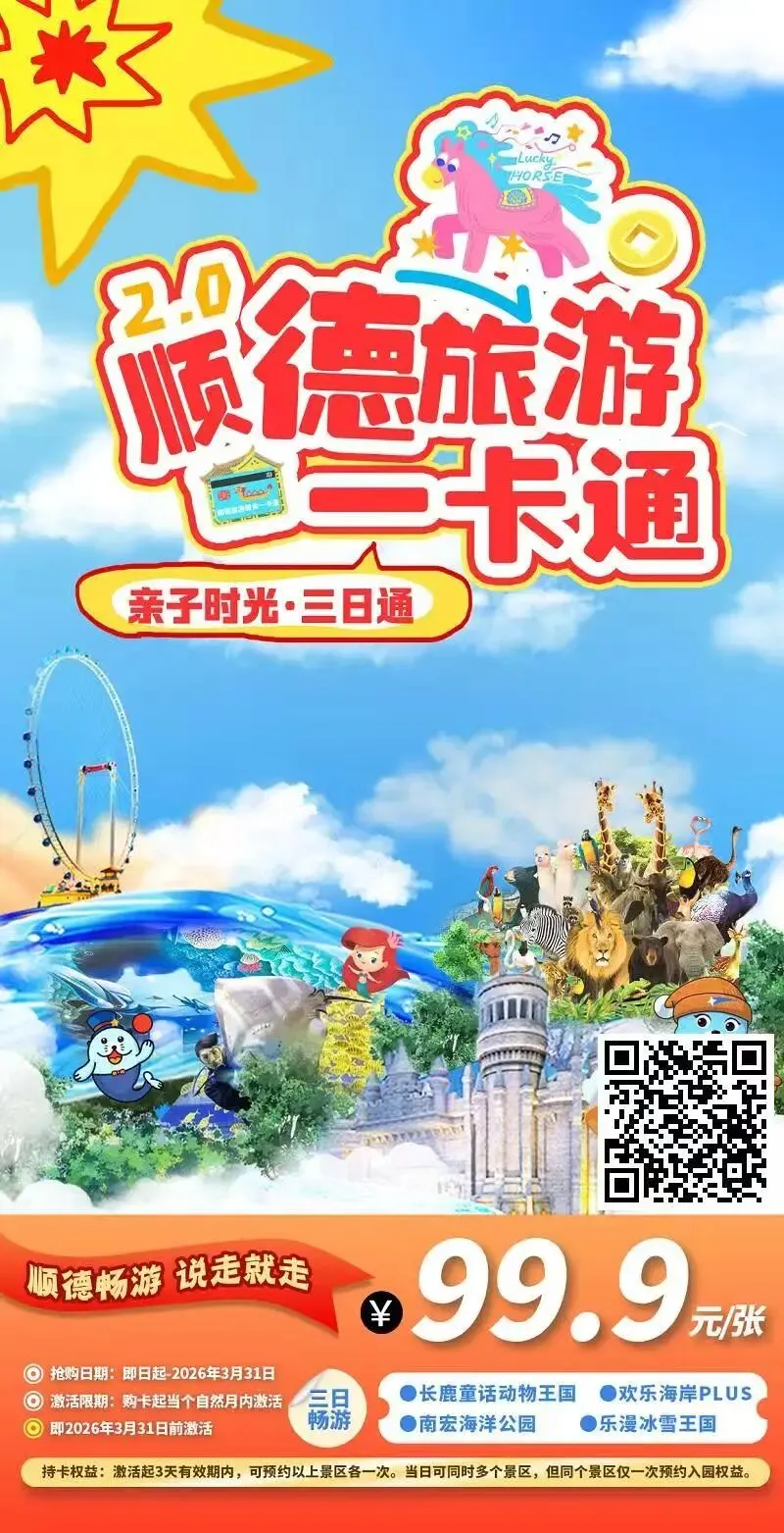 游顺德必备!去一个就回本!99.9元!【2026顺德旅游一卡通2.0】3天·玩转顺德:欢乐海岸PLUS、长鹿童话动物王国、乐漫冰雪王国 👆👆长按二维码即可抢购 👆👆长按二维码即可抢购 👆👆长按二维码即可抢购 (若wifi状态下打不开可切换手机信号再打开) *更多特价旅游、爆款优惠、着数福利欢迎咨询客服微信:SDRW99