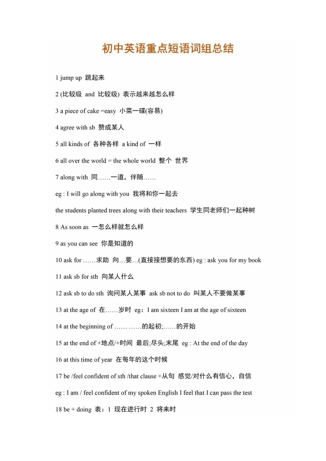 【可打印】初中英语重点短语汇总 由于微信更改了推送规则,为了避免第一时间错过文章更新,伙伴们可以将“初高中英语天天练”设为“星标”,我们就能第一时间相见♡ 电子版文档请拉至文末查看获取方式 点击左下角”阅读原文”获取上述文件,建议先保存再下载。 // 免责声明 本公众号部分转载的文章、图文、视频来自网络,其版权和文责属原作者所有,若来源标注错误或侵犯到您的权益,烦请告知,我们将立即删除。