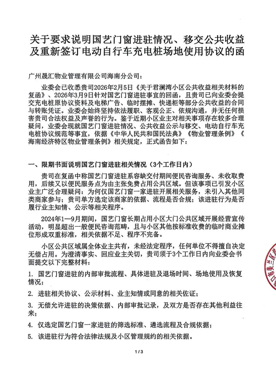 为保障全体业主合法权益,回应大家对小区公共事务的合理关切,尤其针对国艺装饰公司(函件简称“国艺门窗”)独家进驻小区大门、长期未收取任何进场费的问题——参照物业台账300元/天摆摊费,该长期独家驻场本可为小区带来可观公共收益,却以“便民服务”之名免费使用,直至摊位因台风损毁才终止。业委会依据相关法律法规,就国艺装饰公司独家驻场、小区公共收益移交等事宜,正式函告广州晟汇物业管理有限公司海南分公司,要求其作出书面说明并完成整改。