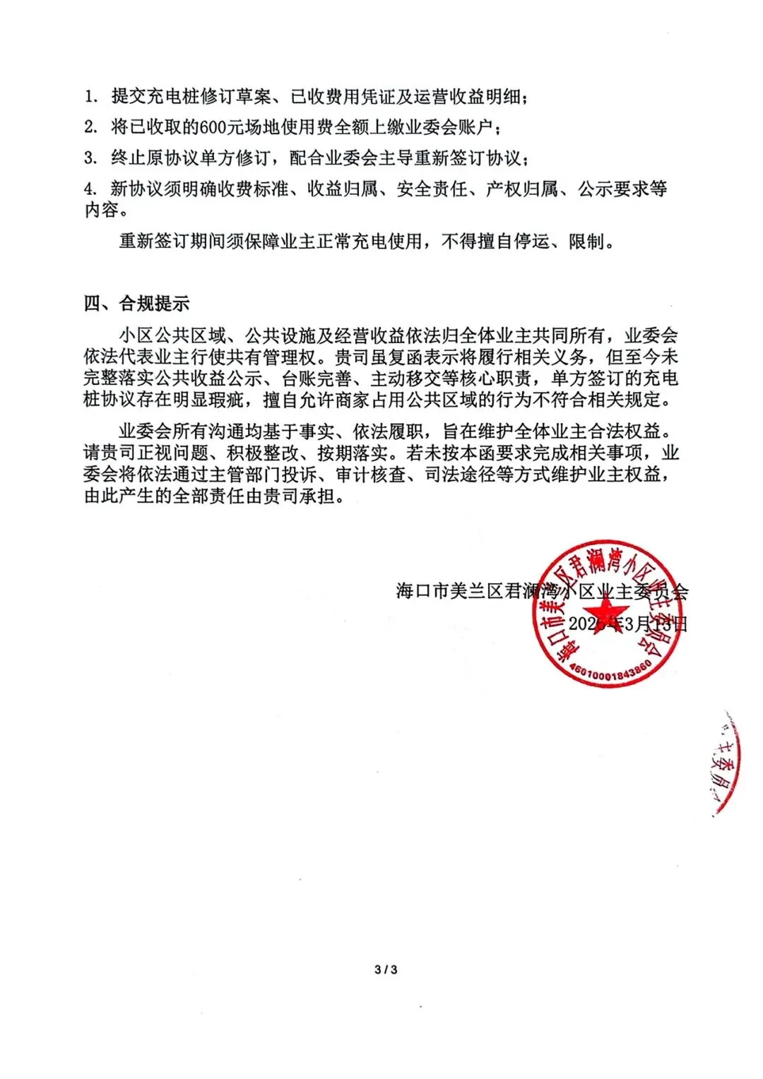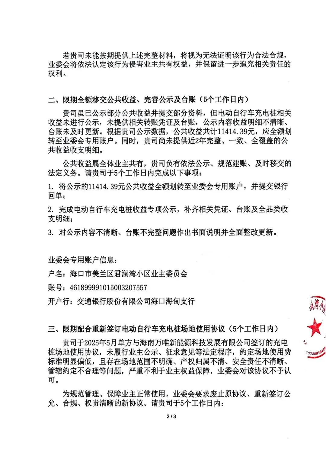 2. 理性沟通:本函件及附件内容均为客观文书材料,业委会的所有沟通均在法律框架内开展,旨在维护全体业主合法权益,也欢迎物业方积极主动对接整改。