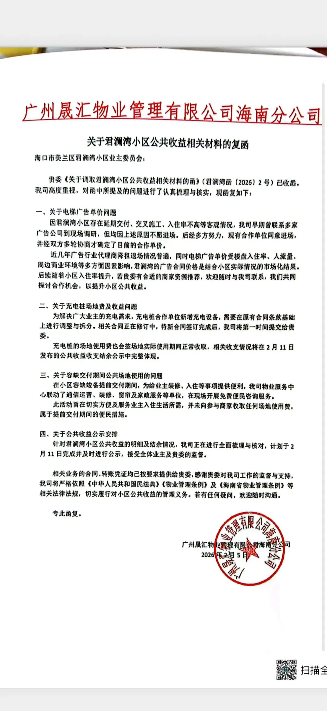 现将业委会正式函件及物业2月5日相关复函完整公开,接受全体业主监督,相关进展将及时同步。
