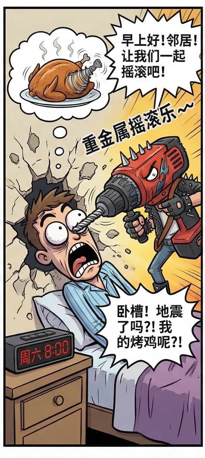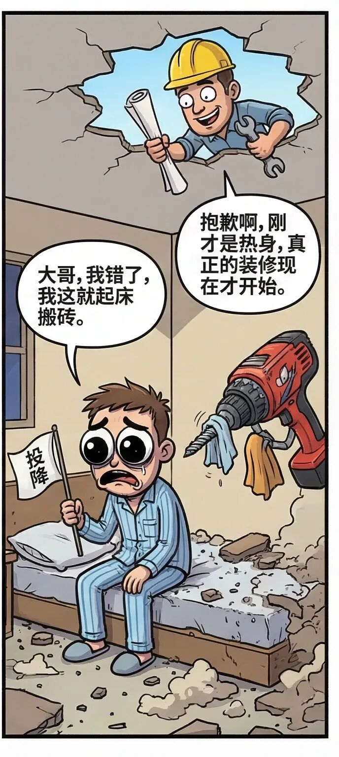 搞笑漫画(183):周末的电钻声比昨晚音乐节嗨歌声更让人上头 【剧场时刻】 我:师傅,能不能晚点钻? 师傅:不行,早起的电钻有墙穿。 我:那能不能小声点? 师傅:这是艺术,艺术是需要爆发力的。 我:那能不能钻我脑子里? 师傅:已经钻进去了,你没感觉吗? 【灵魂拷问】 面对周末早八的装修声,你会? A. 戴耳塞继续睡 (掩耳盗铃) B. 冲上楼去理论 (勇士) C. 起床出门躲避 (惹不起躲得起) D. 跟着节奏一起抖腿 (打不过就加入) #装修#周六早八#电钻惊魂#赖床#搞笑漫画