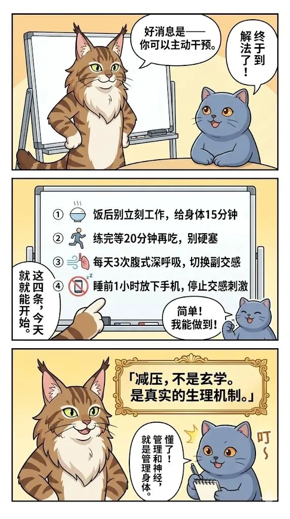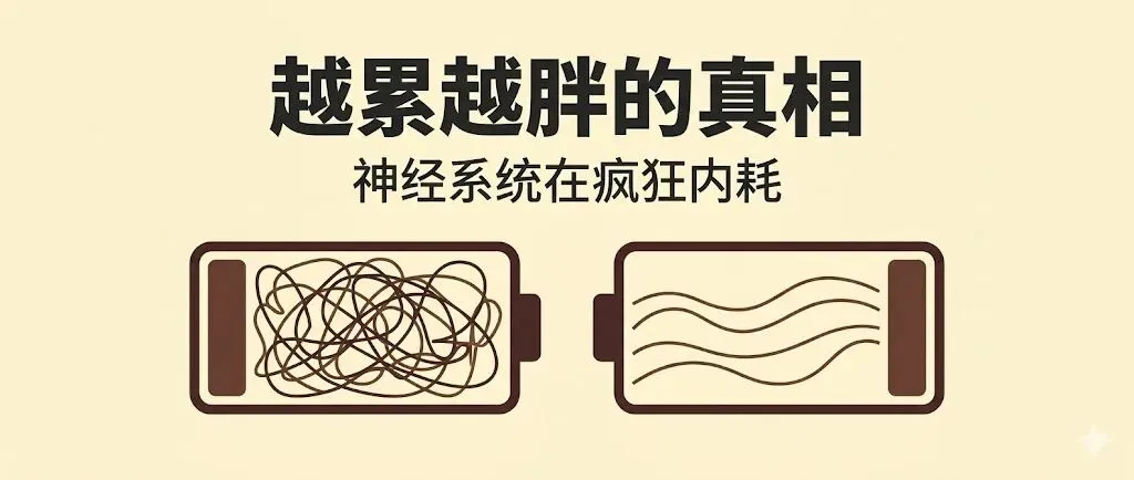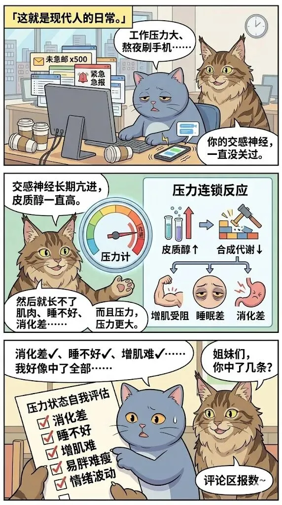 😫 越努力越虚弱?现代打工人:地铁/老板/房贷/熬夜…… 交感神经24小时踩死油门 皮质醇持续飙升→肌肉分解→睡不好→消化差压力越大,身材越差,压力更大——死循环