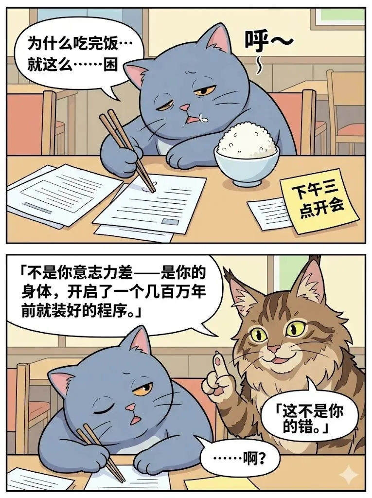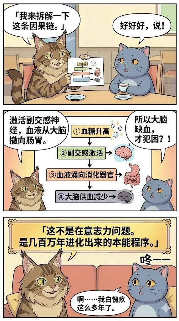 🍚 吃饱为什么犯困?进食→血糖升→副交感强制接管→ 血液全涌向肠胃→大脑供血不足→困这是进化出来的强制休眠程序,不是你意志力差!
