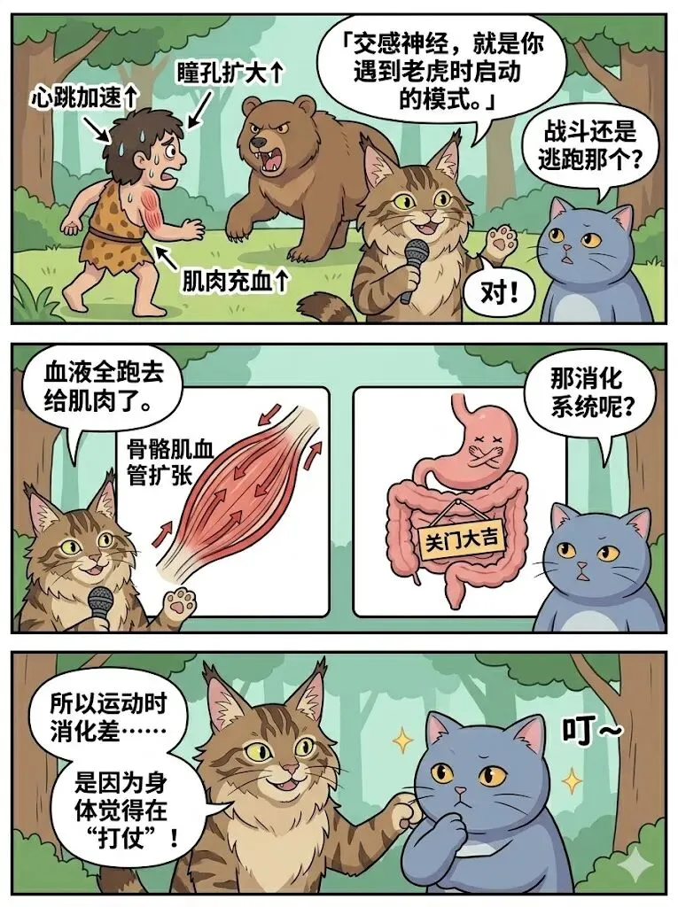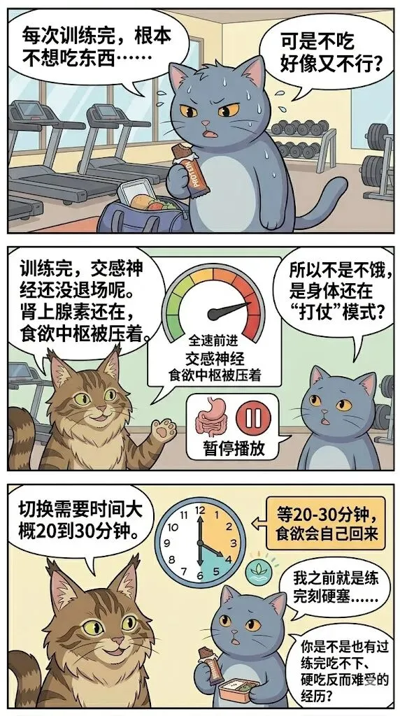🏋️ 练完为什么吃不下?高强度训练→交感神经暴走→ 肠胃直接罢工→强行吃东西=两套系统打架建议练完等20-30分钟再吃,吸收效率翻倍!