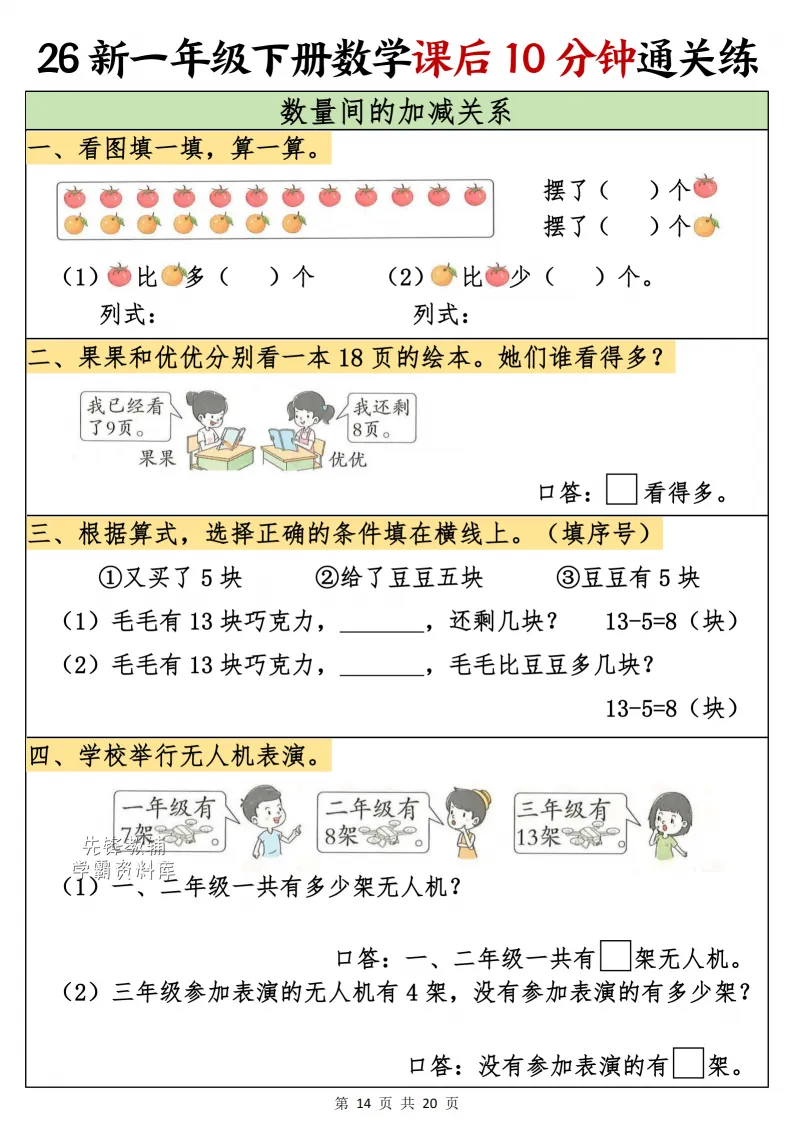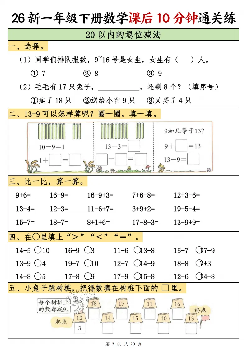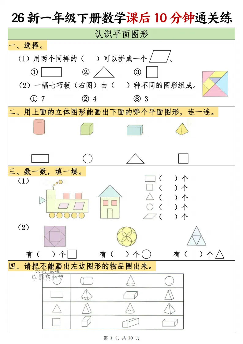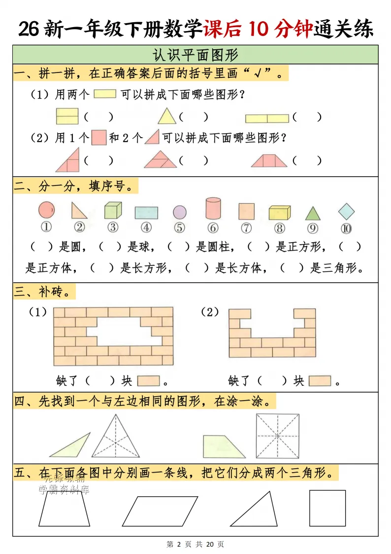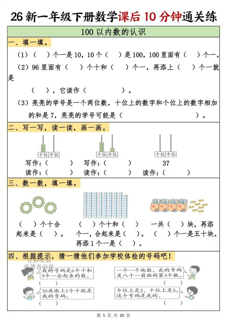 一年级(下)数学课后10分钟通关练,电子版可打印 点击上方关注领取更多学习资源 一年级(下)数学课后10分钟通关练,电子版可下载,同步教材每课内容。需要的家长抓紧打印出来,让孩子用起来。 (温馨提示:文末有完整电子版领取方式) 免费领取电版 关注公众号:“博学小课堂” 文章文末:点赞+再看 发送关键字:260314 说明 教辅在精不在多 ,如果觉得资料好,孩子需要正常使用 ,建议购买正版图书本公众号分享教辅资料,是为了给大家介绍、展示教辅资料的内容和特点,推荐大家购买正版教辅。 为了更好地展示资料的情况,我们可能会用到一些资料的截图、官方的样书,或者网络上公开的电子资料,如果权利人认为这些展示可能会侵害到您的权利,请直接告知我们,我们会立刻删除。