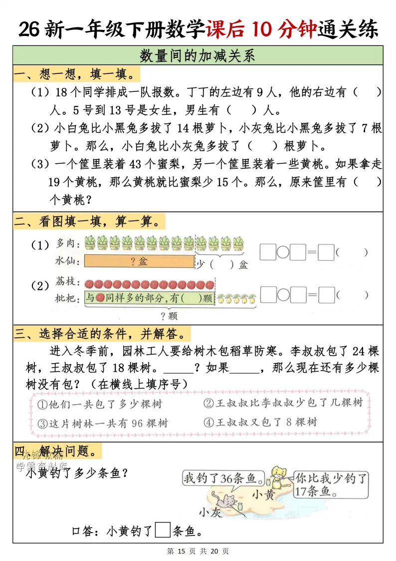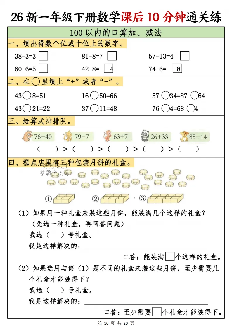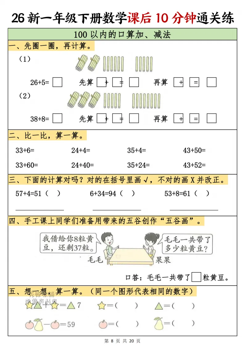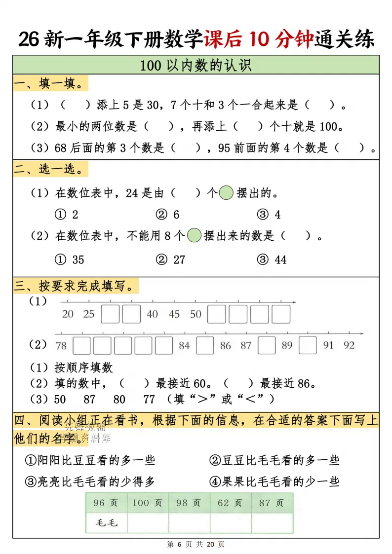 一年级(下)数学课后10分钟通关练,电子版可打印 点击上方关注领取更多学习资源 一年级(下)数学课后10分钟通关练,电子版可下载,同步教材每课内容。需要的家长抓紧打印出来,让孩子用起来。 (温馨提示:文末有完整电子版领取方式) 免费领取电版 关注公众号:“博学小课堂” 文章文末:点赞+再看 发送关键字:260314 说明 教辅在精不在多 ,如果觉得资料好,孩子需要正常使用 ,建议购买正版图书本公众号分享教辅资料,是为了给大家介绍、展示教辅资料的内容和特点,推荐大家购买正版教辅。 为了更好地展示资料的情况,我们可能会用到一些资料的截图、官方的样书,或者网络上公开的电子资料,如果权利人认为这些展示可能会侵害到您的权利,请直接告知我们,我们会立刻删除。