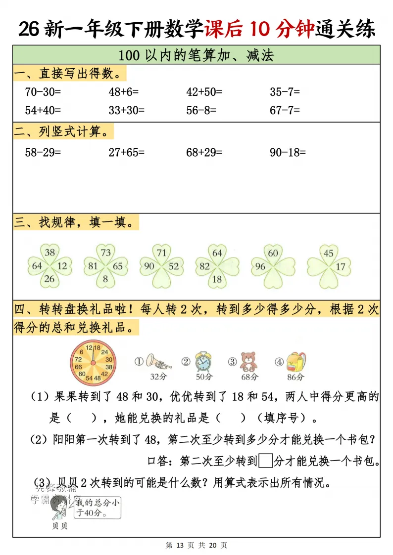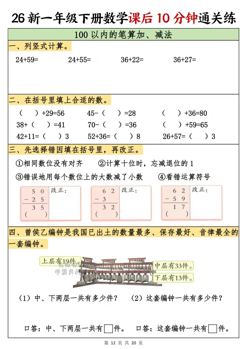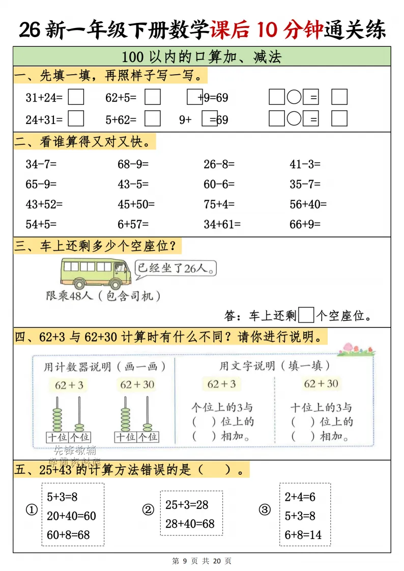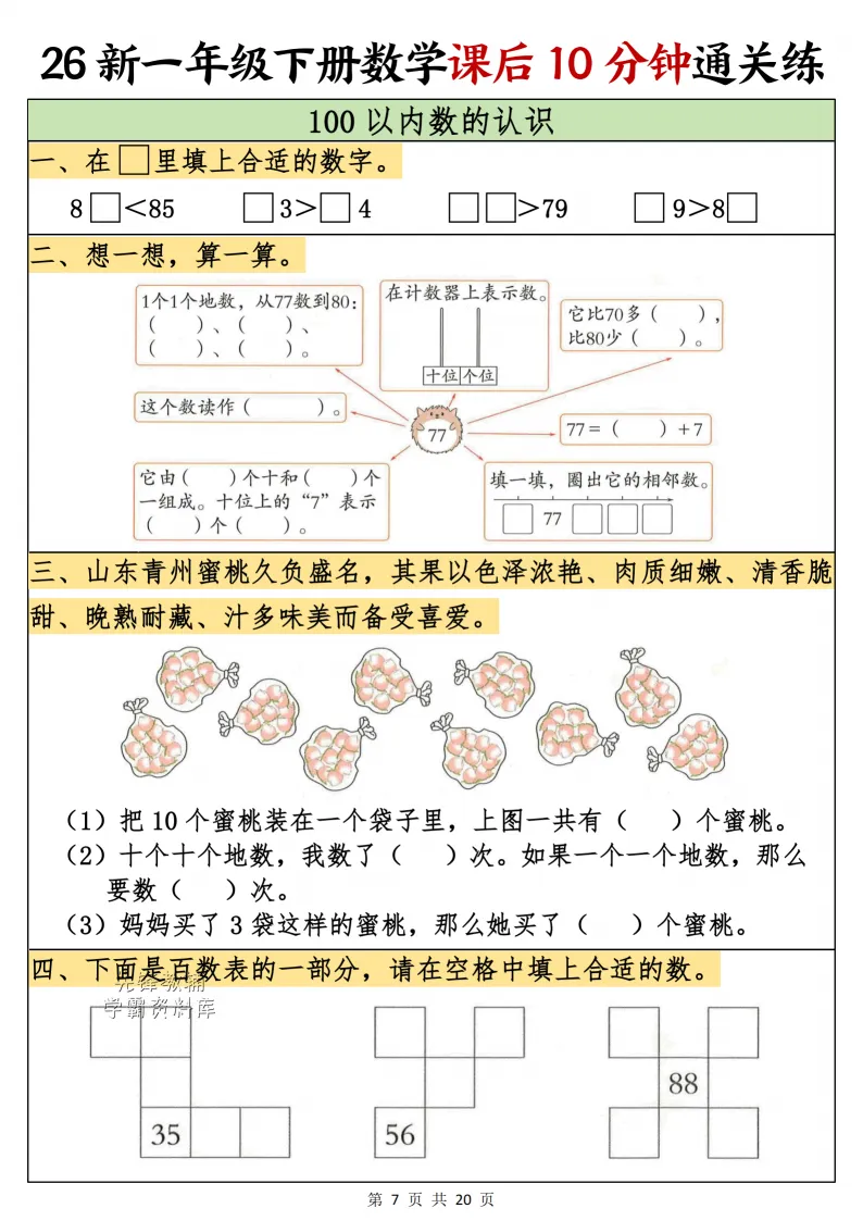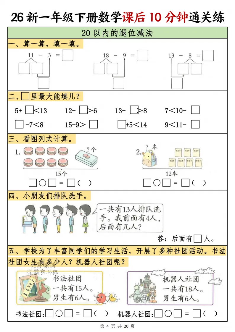 一年级(下)数学课后10分钟通关练,电子版可打印 点击上方关注领取更多学习资源 一年级(下)数学课后10分钟通关练,电子版可下载,同步教材每课内容。需要的家长抓紧打印出来,让孩子用起来。 (温馨提示:文末有完整电子版领取方式) 免费领取电版 关注公众号:“博学小课堂” 文章文末:点赞+再看 发送关键字:260314 说明 教辅在精不在多 ,如果觉得资料好,孩子需要正常使用 ,建议购买正版图书本公众号分享教辅资料,是为了给大家介绍、展示教辅资料的内容和特点,推荐大家购买正版教辅。 为了更好地展示资料的情况,我们可能会用到一些资料的截图、官方的样书,或者网络上公开的电子资料,如果权利人认为这些展示可能会侵害到您的权利,请直接告知我们,我们会立刻删除。