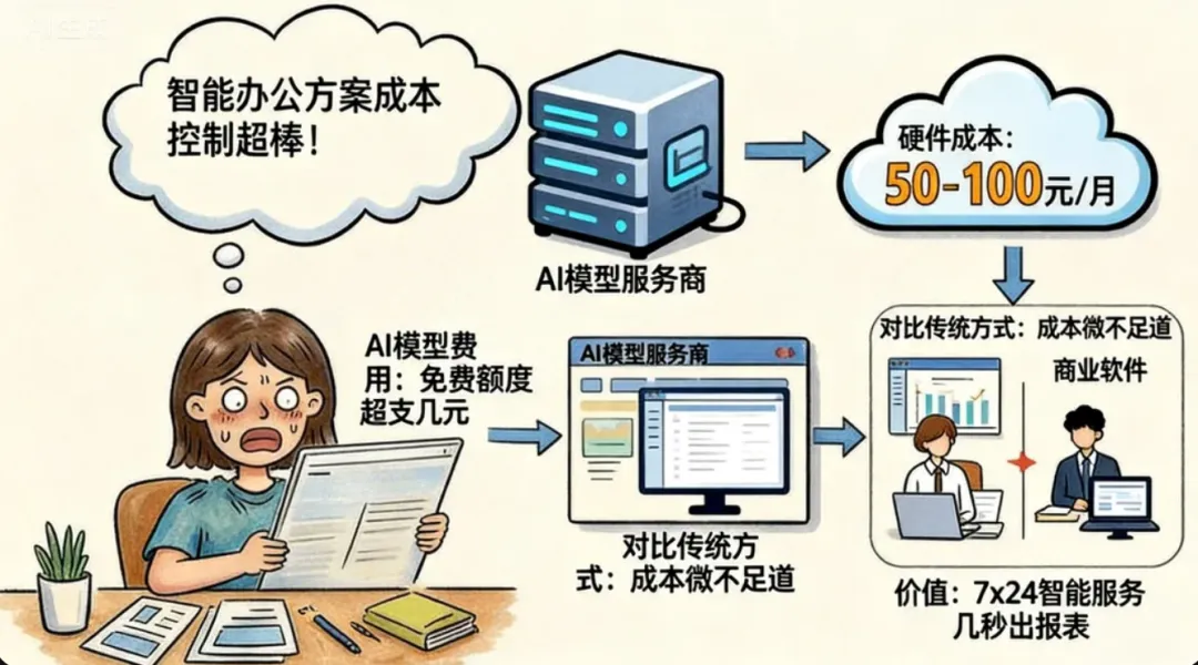 硬件成本方面,一台配置适中的云服务器就能满足需求,每月的费用在50-100元左右。AI模型费用方面,可以选择国内的模型服务商,很多都提供不错的免费额度,即使超出也只需几十块钱。