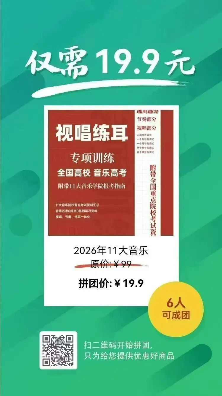 🔥艺考最稀缺视唱真题合集来了,原价99一套,免费送价值900元的11 大音乐学院报考指南电子版(近400页,助你冲刺名校,群友福利拼团今天只要19.9元,随时结束拼团恢复原价‼‼‼