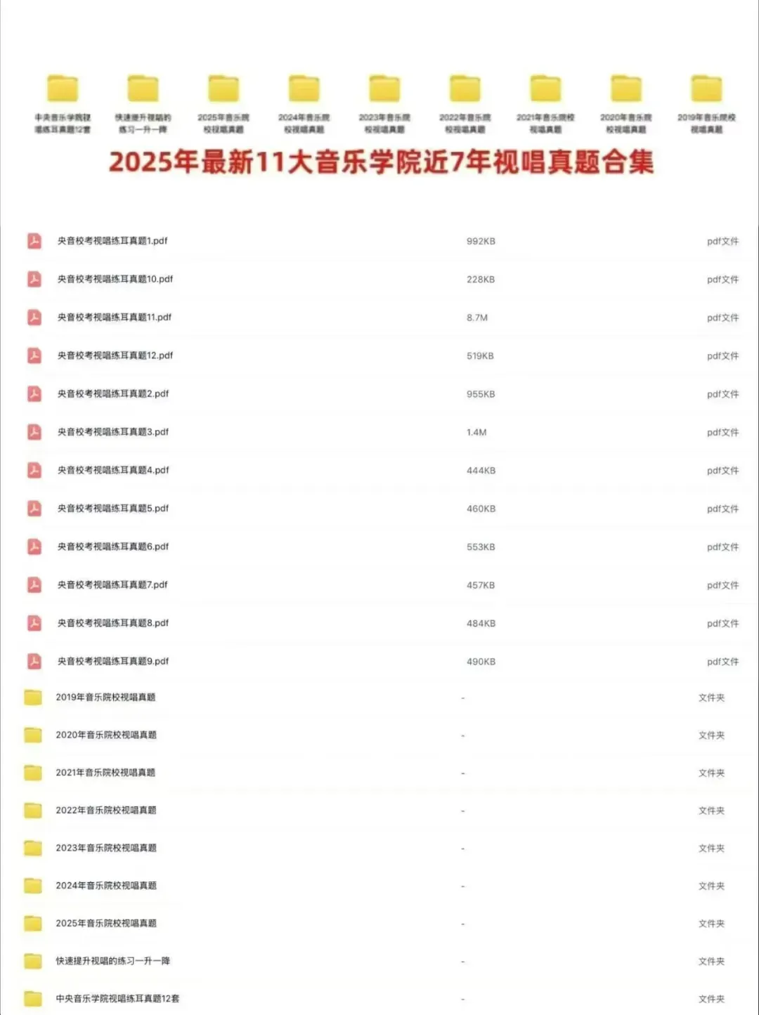 3️⃣超值资料包:高清 PDF + 真题合集,即学即用课程附赠高清 PDF 电子版资料,包括11 大音乐学院近 7 年视唱真题,还有视唱练耳专项训练视频资源。这些资料均为最新整理,时效性强、针对性足,可反复学习、随时演练,帮你把知识转化为应试能力,巩固训练成果。