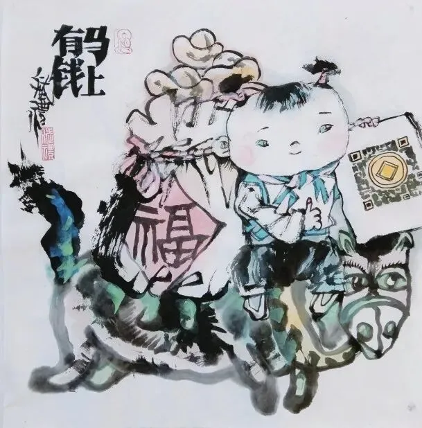 从《马上有钱》中孩童手持二维码与元宝的趣味组合,到《马上转运》里女子捧金锭与神骏的互动,再到《马上有福》中骑“马”送福的诙谐形象,王斌礼并未陷入固有的描摹。