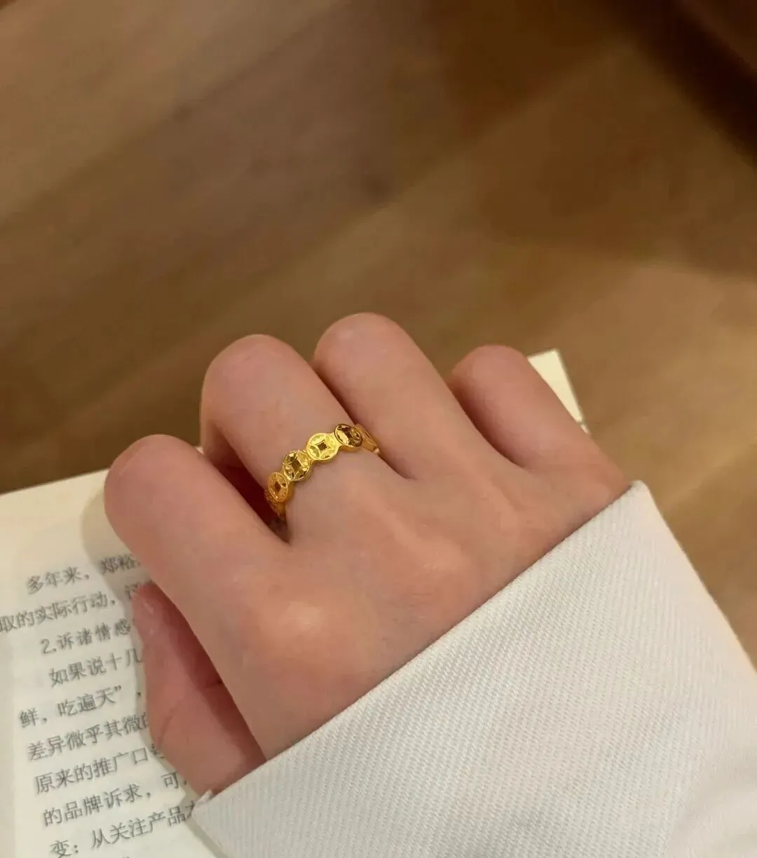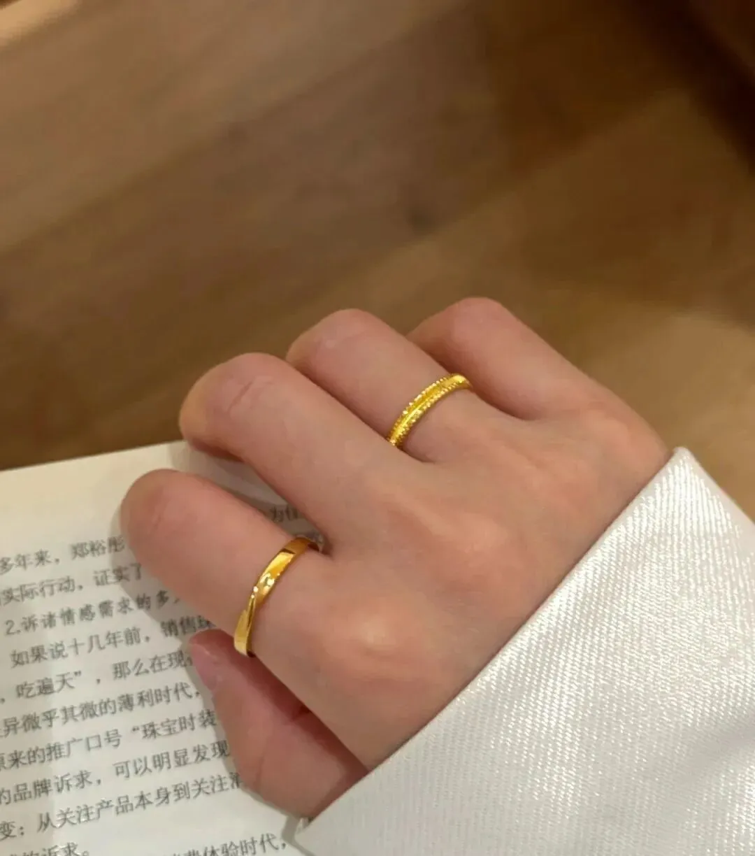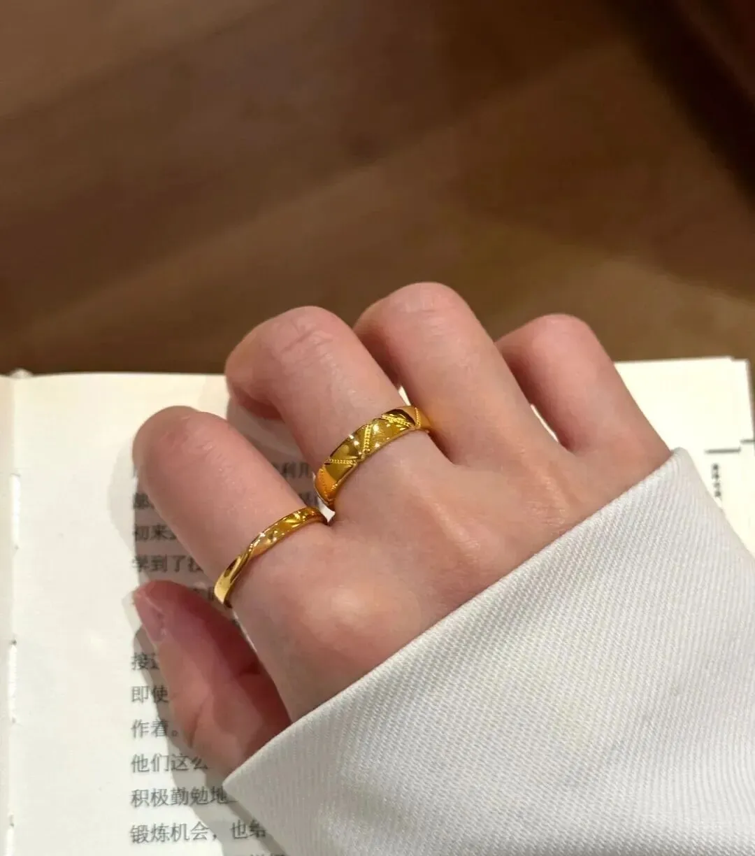 最让我满意的是那枚宽版的 设计感特别强 戴在中指上气场全开 这枚其实是我跟老公结婚纪念日的时候他送的 他说钻戒虽然浪漫 但黄金更实在 以后万一家里需要钱 这些金子都能帮上忙 当时听着还觉得他不够浪漫 现在想想 这才是真正的踏实 ❤️