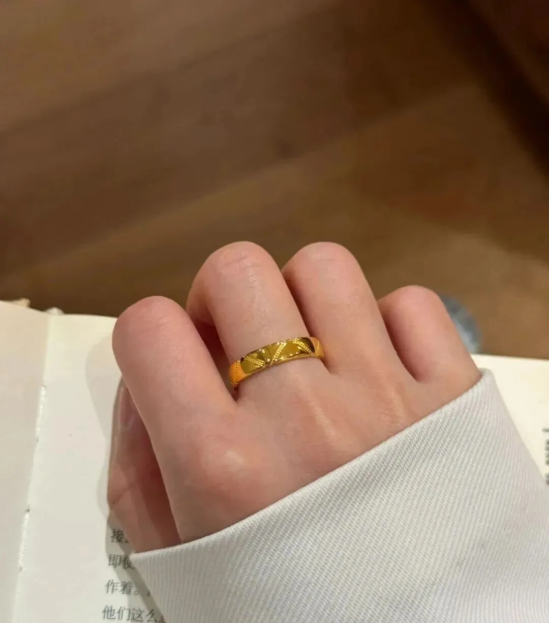 后来慢慢发现 黄金戒指真的越买越上瘾 那枚带花纹的是去年生日的时候买的 当时看中它的雕花工艺 师傅手工一点点敲出来的纹路 在灯光下会反射出不同的光泽 特别有质感 虽然克重稍微大一点 但想到现在金价这么贵 早买一天都是赚到