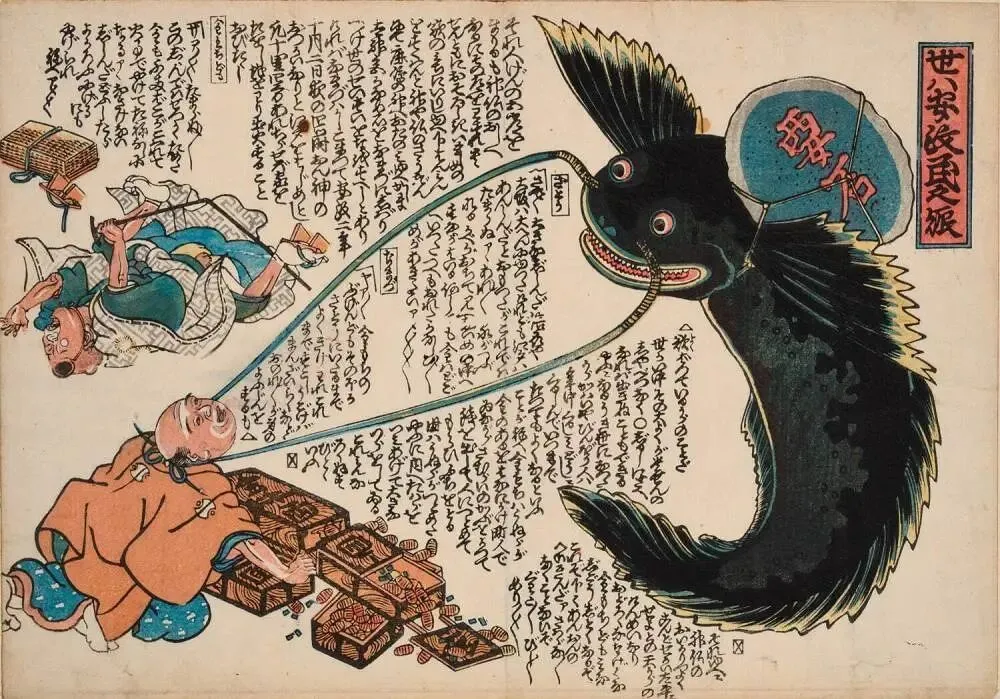 德川时代漫画发达的原因,一则由于时世太平,上下共乐。二则由于木版画的流行。第三个重要的原因,是“浮世绘”的发达。所谓浮世绘,是描写世态人情的一种民众艺术。前面说过,美术初从中国输入日本时,尽是佛菩萨的图像,即所谓宗教艺术。浮世绘便是宗教艺术的反动。全以人生日常琐屑生活为画材,故最能受一般民众的欣赏。浮世绘所以异于漫画者,即前者多工笔而必含有刺或滑稽味。后者则用简笔而含有讽刺或滑稽。然界限很不清楚。浮世绘中有一部分称为“大津绘”的,就是漫画。故大津绘可说是漫画的别名,或前身。