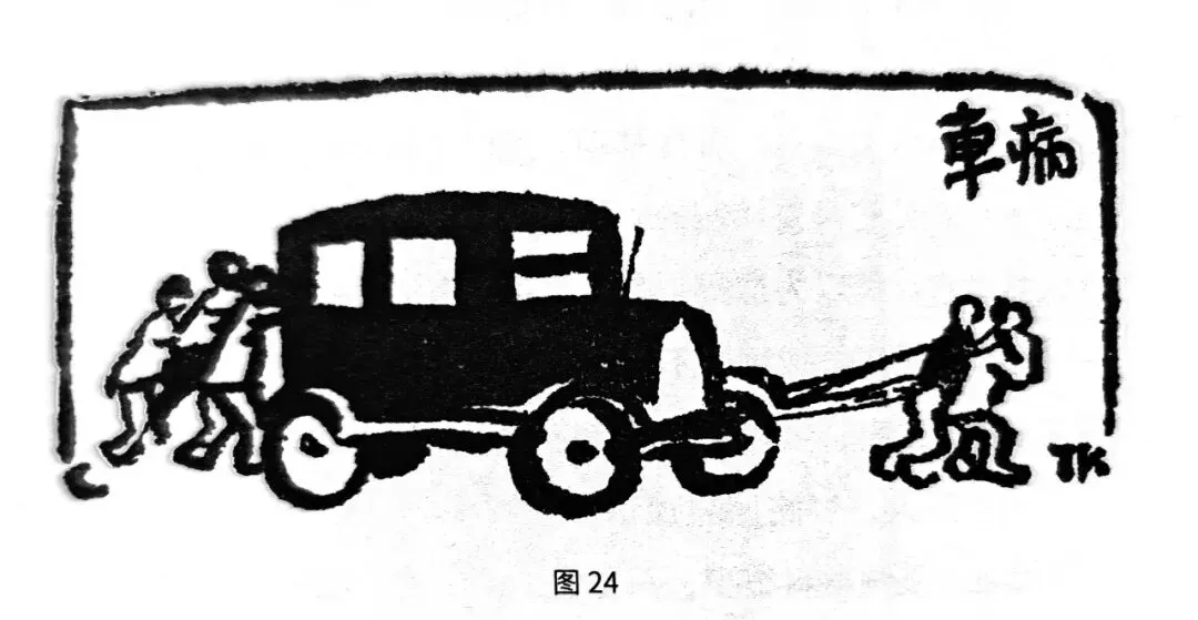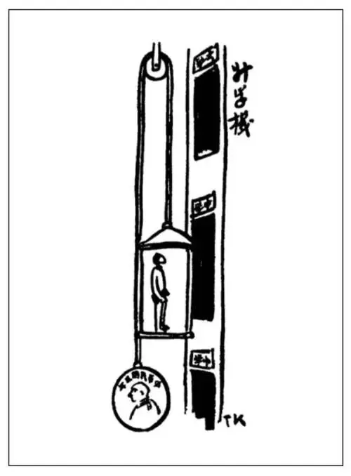的事理,叫作假象法。这就是使无形的事理有形化,所以画面上大都奇怪荒唐。讽刺漫画常用此法。因为人生社会的问题,大都是无形的,不可描表,漫画家要批评议论,自然要用假象。