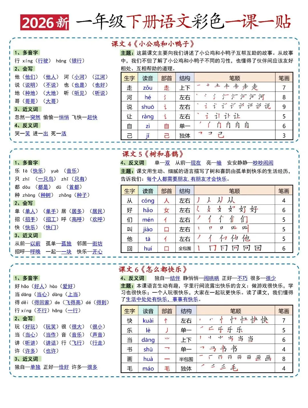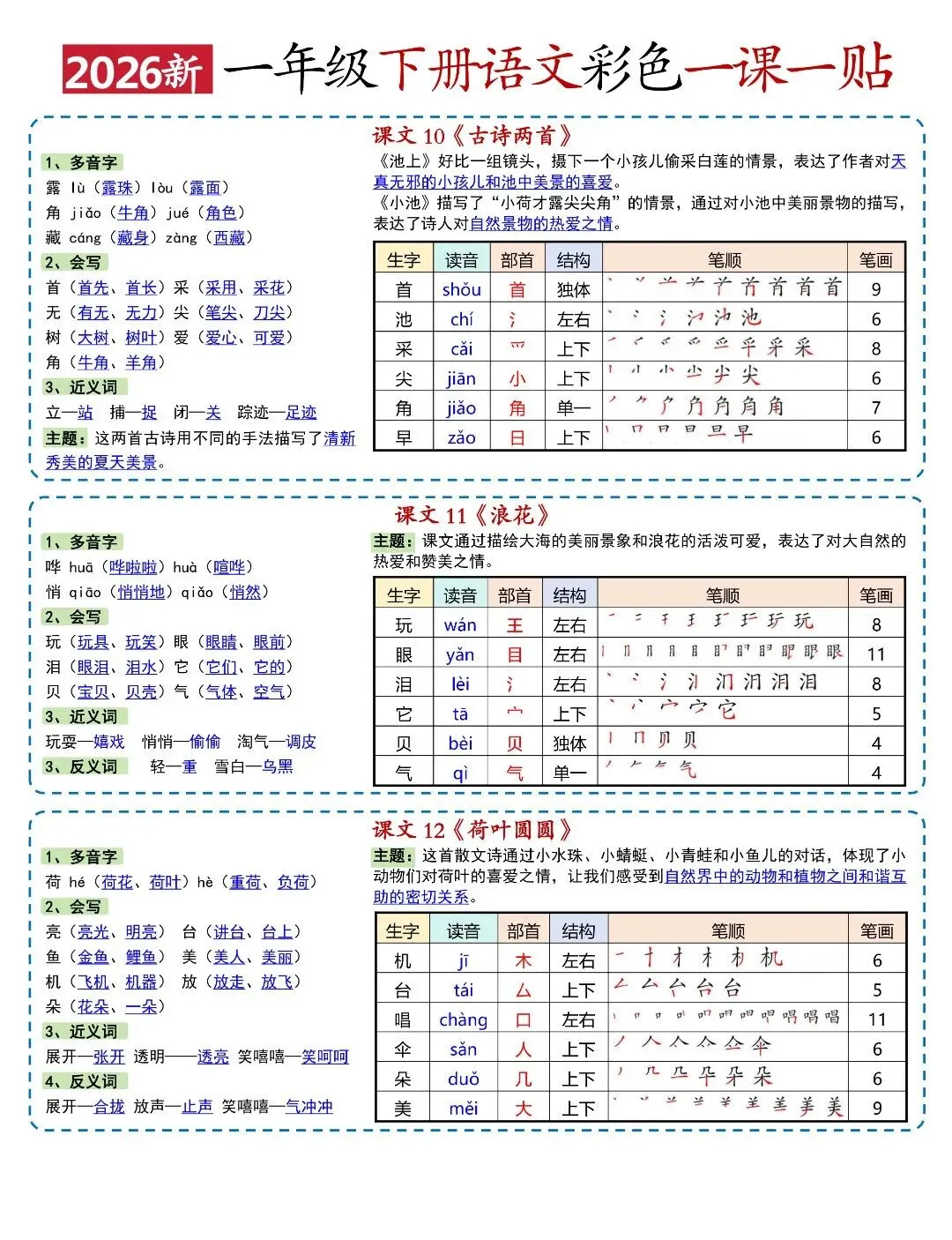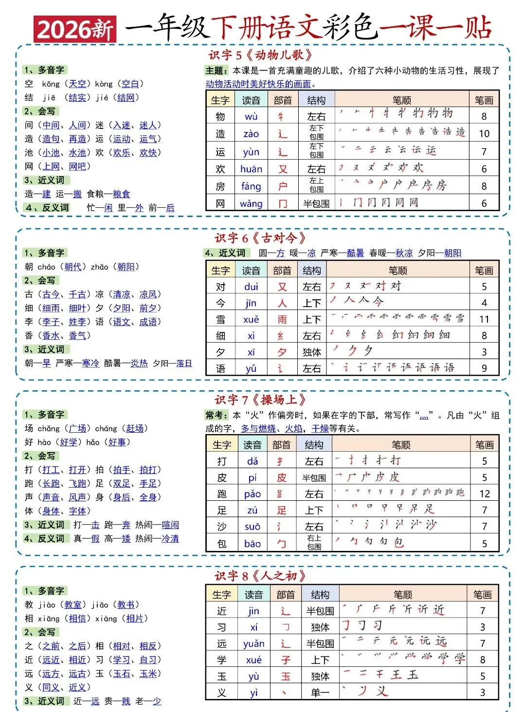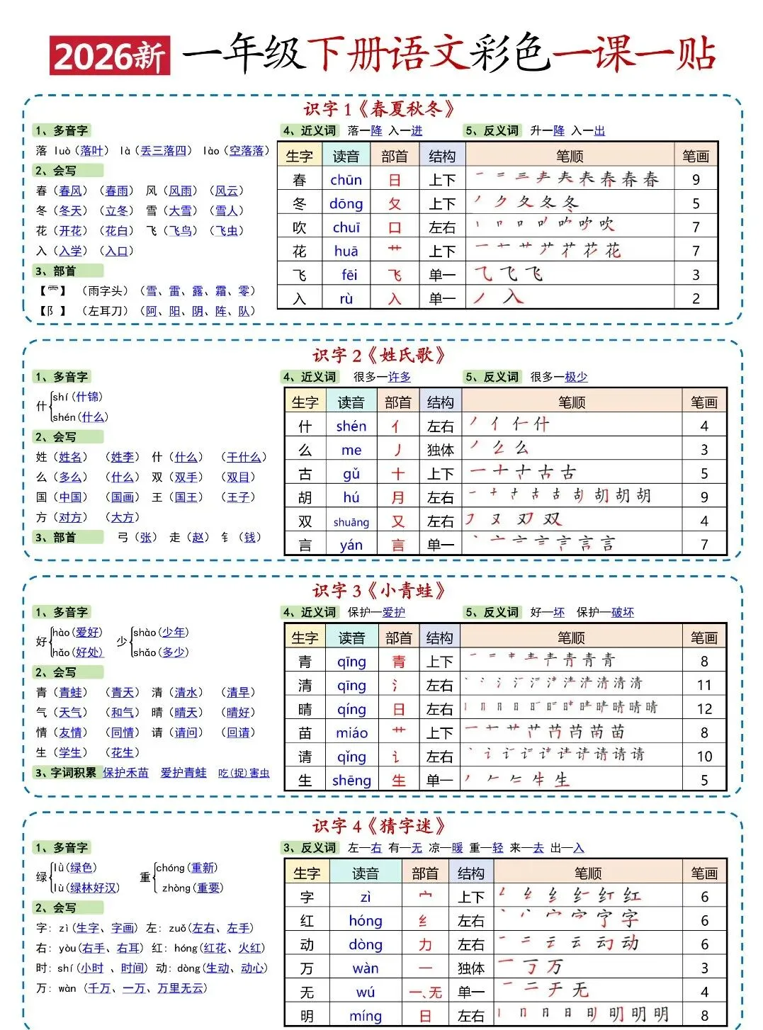 【教辅资源】新版一年级下册语文《每课重点一课一贴》,电子版可下载
