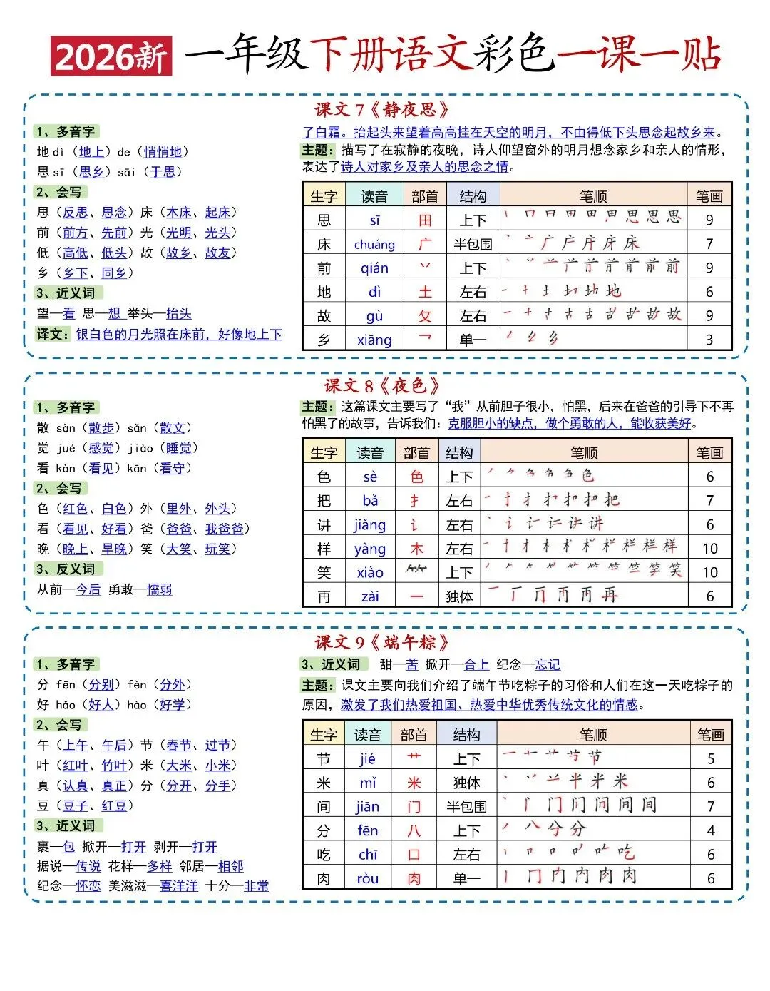 26年人教版一年级下册语文《每课重点一课一贴》,共10页,电子版可打印可下载,这份一下语文课课贴,包含了每篇课文的会写字、多音字、词语积累、近反义词、课文主题等内容。需要的家长抓紧领取上这份语文课课贴,用不干胶打印出来,裁剪粘贴到对应的课文位置,让孩子的语文学习更高效。