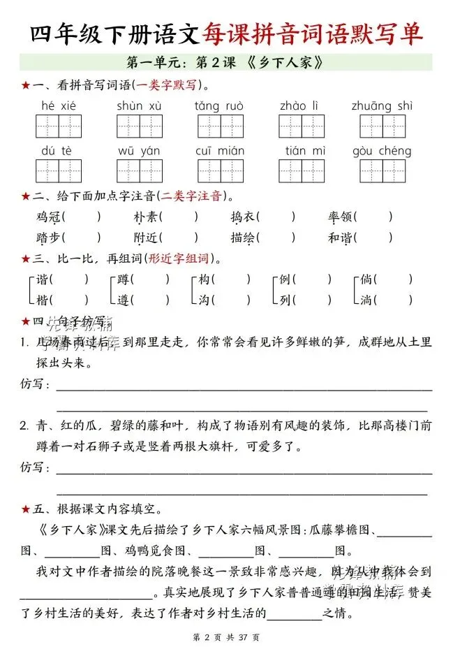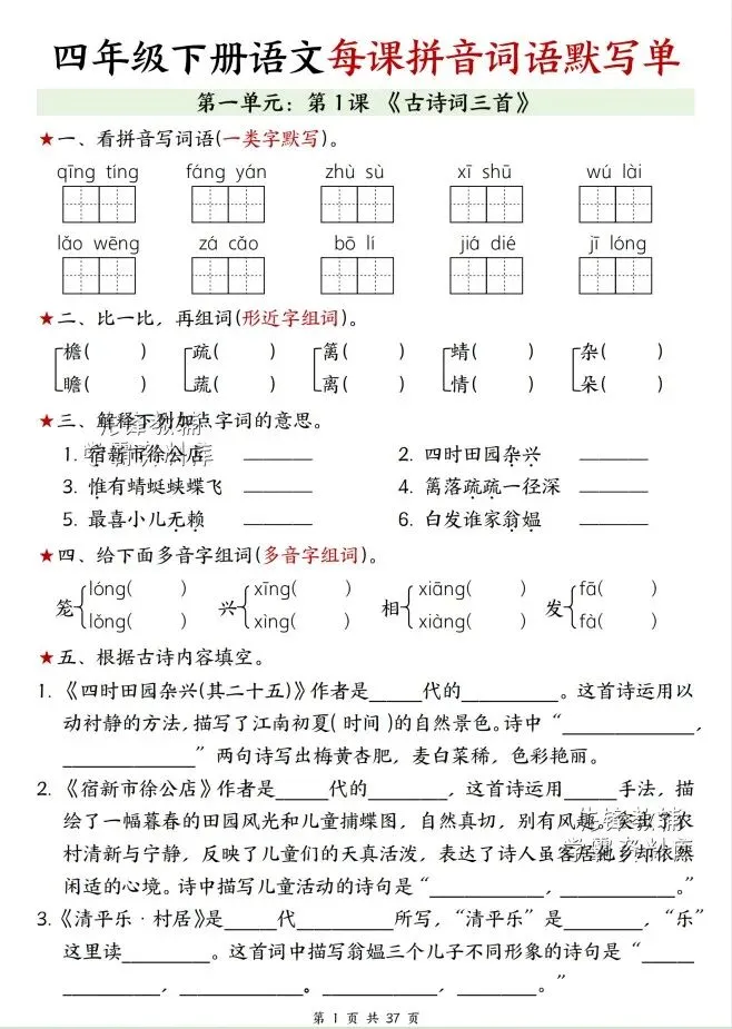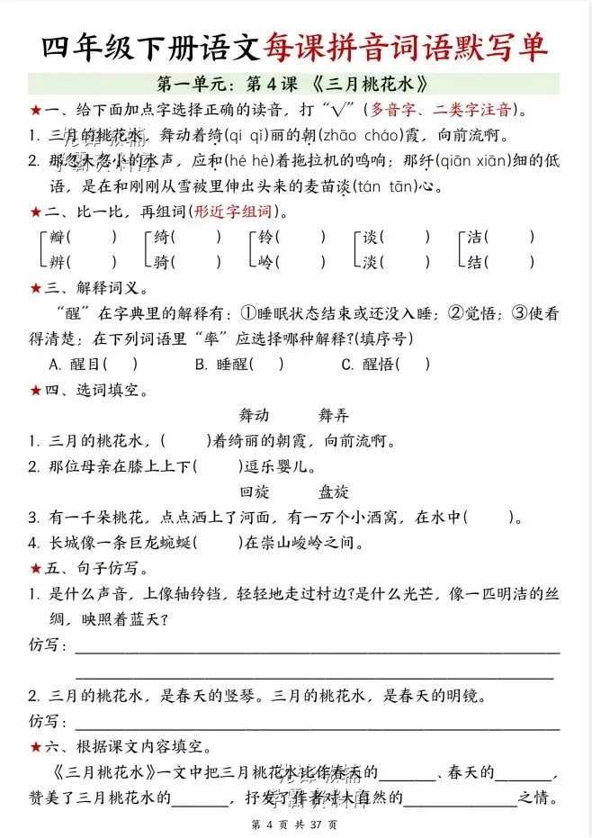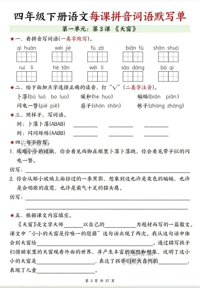 今天给大家整理了26春四下语文每课拼音词语默写单,转发给朋友或班级群,受益更多人,帮助孩子学习!