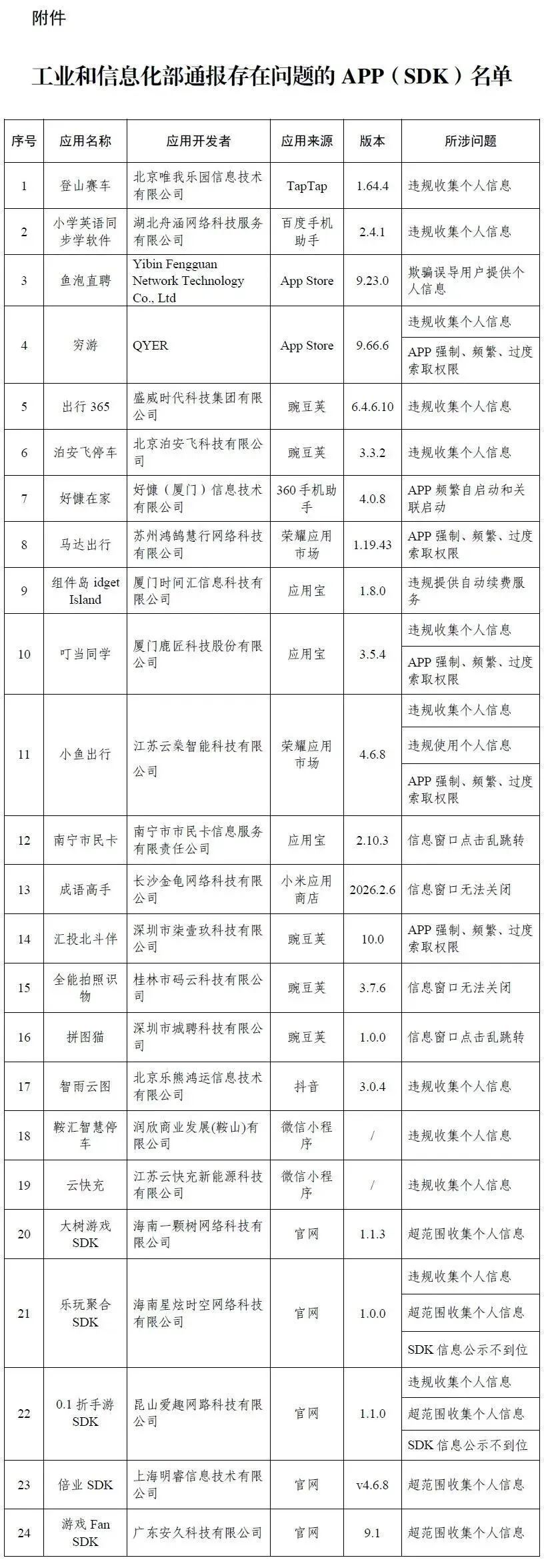存在问题的APP(SDK)名单
