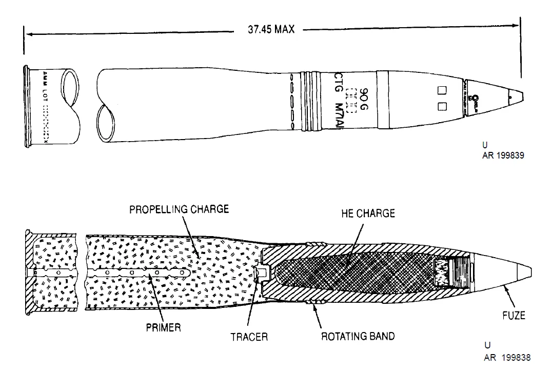 这枚弹药由90毫米火炮发射,主要用于近距离反人员作战。
