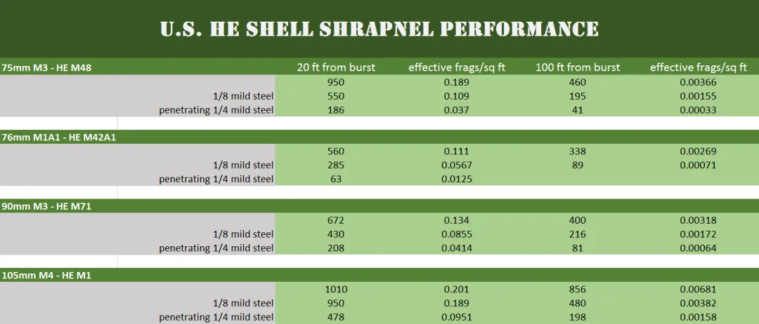 下表由二战装甲历史研究小组根据 TM 9-1907《弹道数据及弹药性能》整理,展示了 90 毫米 M71 高爆弹产生的碎片密度,该弹种代表了冷战初期美国中型坦克使用的 90 毫米炮弹。