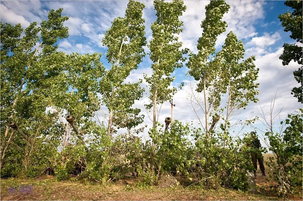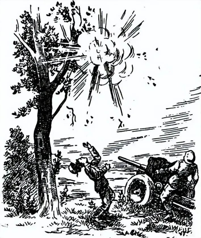 当引信设置为“瞬发”(Superquick)模式时,高爆破片弹(HE-Frag)可以对着反坦克炮阵地附近的树冠射击,并能确保在接触叶片或树枝时立即起爆。这实质上产生了一种空爆效果,极大概率能消灭整个炮组,甚至可能损毁火炮本身,使其无法被附近的步兵重新启用。隐藏在森林边缘或孤树下的反坦克炮一旦被发现,通过这种方式可以被迅速肃清。下方的示意图展示了这一过程。值得注意的是,图中所示场景仅用于说明目的,因为野战手册严禁利用孤树或丛林簇进行隐蔽,因为它们在开阔地中非常显眼,是敌方坦克手最先搜索的地理标志。