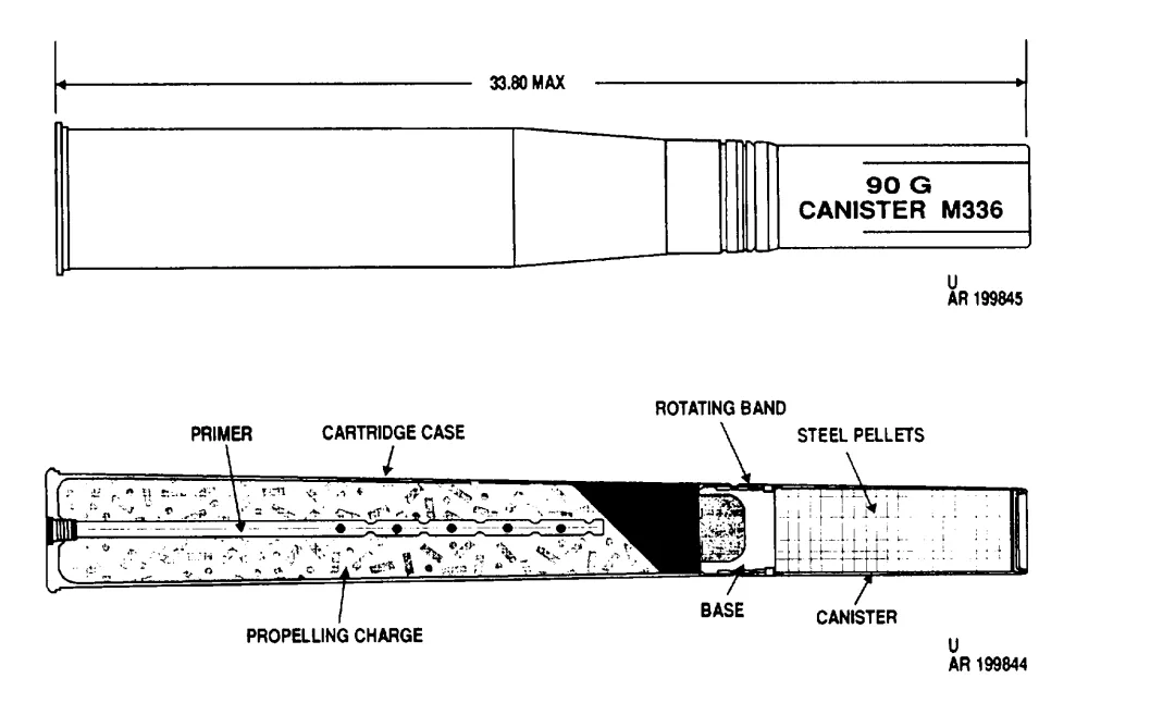 90毫米 M336 霰弹反人员弹是一种弹药,内部装有 1,280 颗钢制小球,用于近距离反人员作战。火炮发射瞬间
