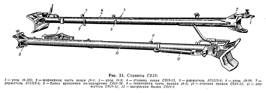当处于行军状态时,炮架大架由一根横杆固定在一起。这根横杆同时兼作火炮的行军锁——杆上带有一个孔,可以套在炮尾环(Breech housing)上的凸起耳片上,从而将火炮牢牢固定。这种将行军锁与大架固定杆合二为一的设计,是因为该炮缺乏类似 ZiS-2、ZiS-3 和 BS-3 那样的后坐导轨(在那些火炮上,行军锁耳片通常设在导轨上以便与大架咬合)。