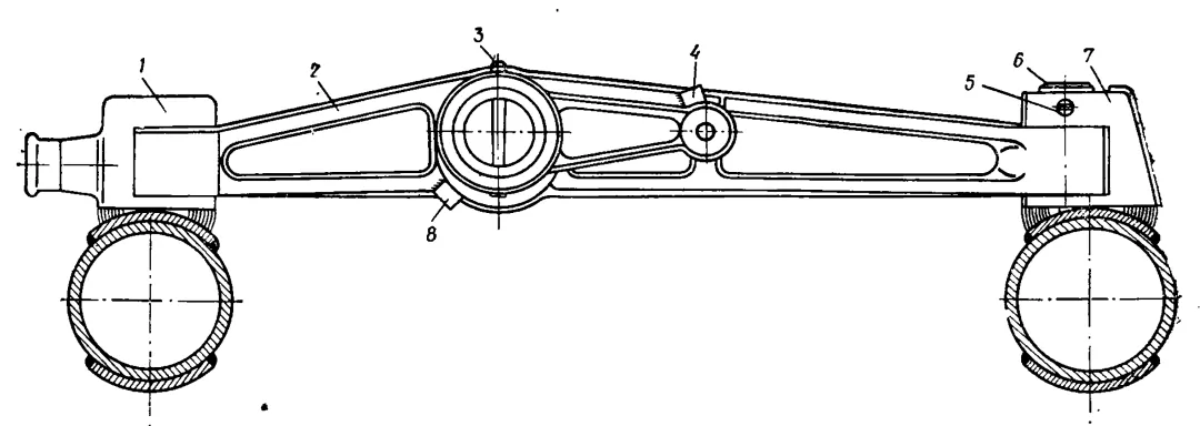 炮架的横梁是一个铸钢梁,如上图所示。它作为火炮的安装基座,上方有一个凸出的旋轴用于火炮的水平转动,而其空心的内部容积则安置了悬挂系统的扭杆。横梁是整个武器的核心枢纽,车轮、大架和火炮均安装于此,从而构成一个完整的武器系统。