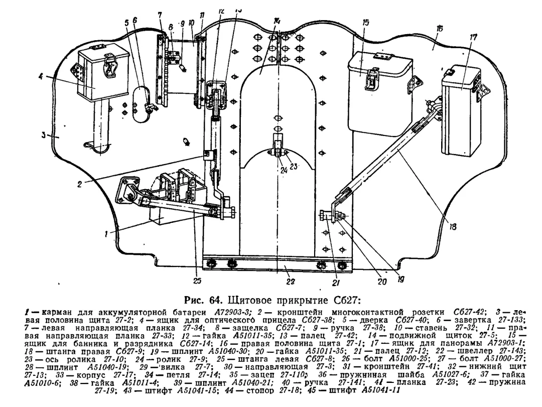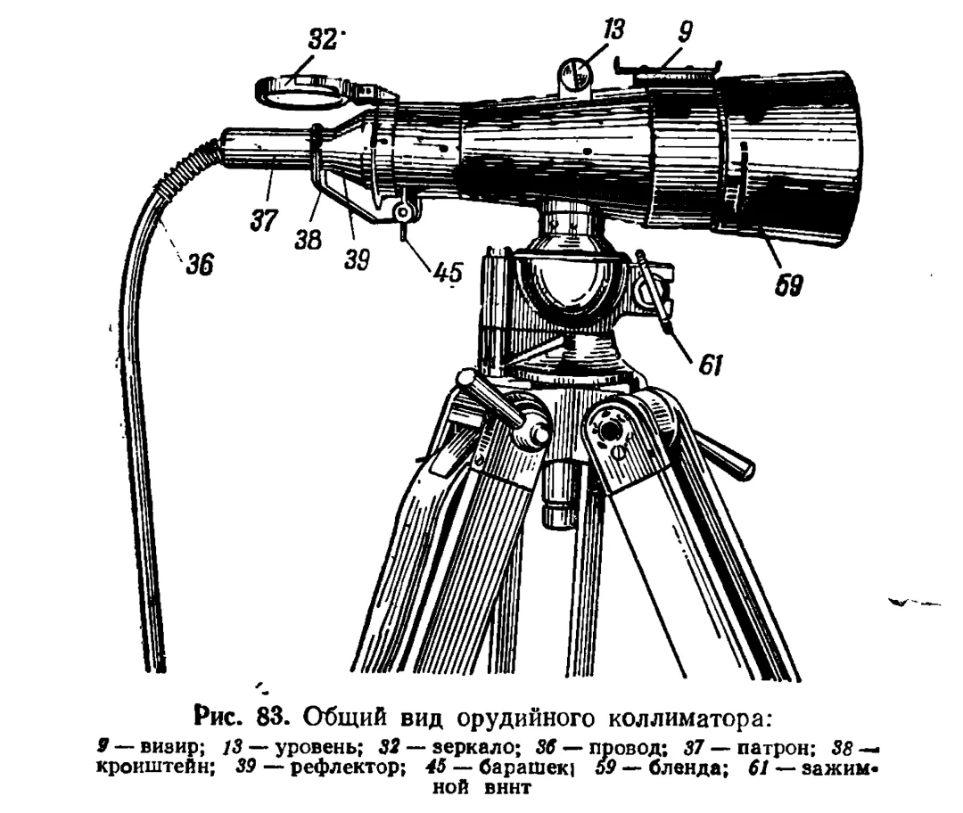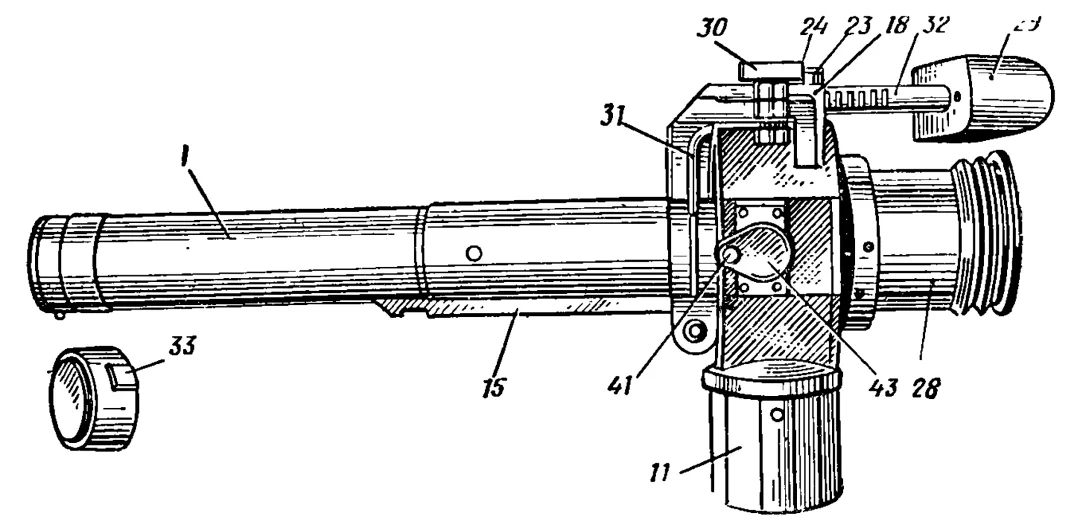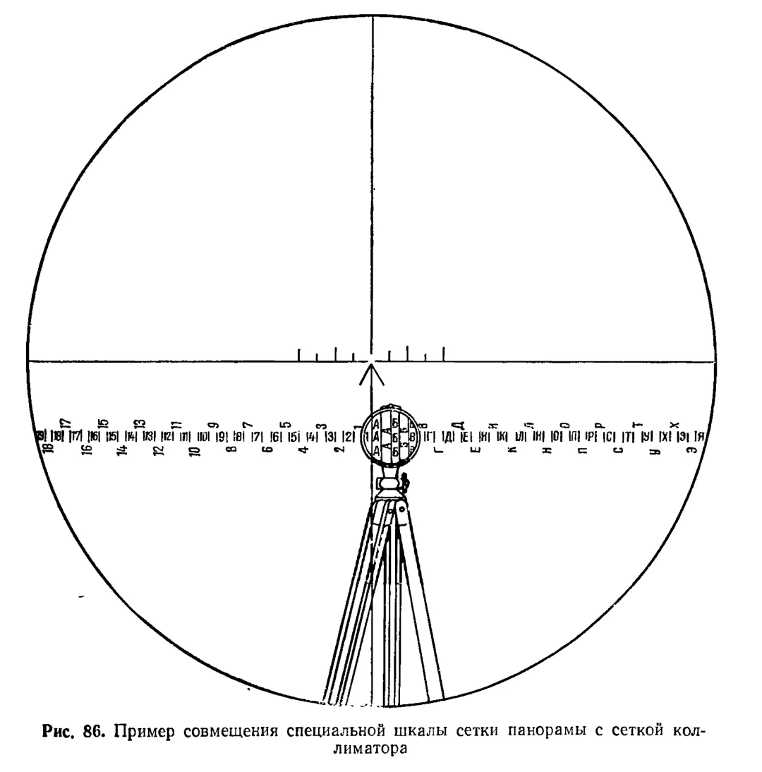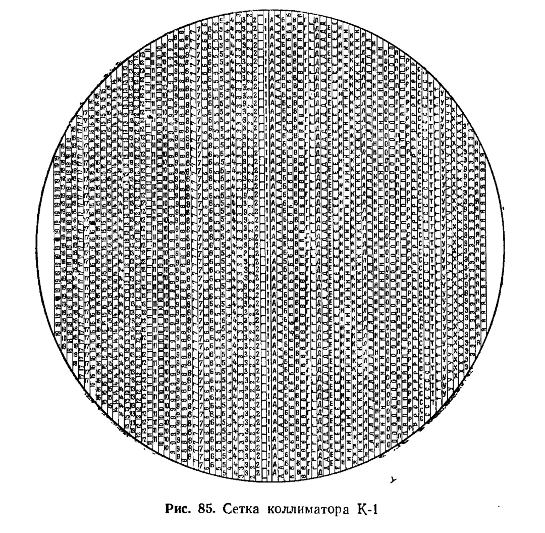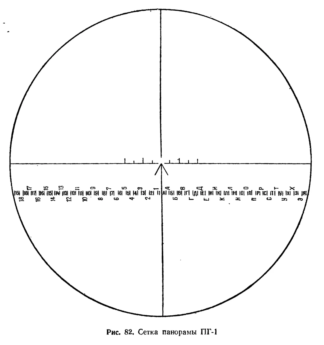 在能见度较低的条件下(如夜间,或远处的地标被烟雾、大雪、大雨遮蔽时),可以使用 K-1 准直仪装置替代 PG-1 全景瞄准镜。K-1 是一个独立的三角架安装单元,旨在设置在牵引火炮的后方或侧方,并与 PG-1 保持一定的距离。其使用方法是将 PG-1 取景器中的方位代码与 K-1 显示屏上的刻度进行对齐。如上图右侧绘图所示,包含 K-1 刻度的标尺可以在 PG-1 取景器的十字准线下方看到。